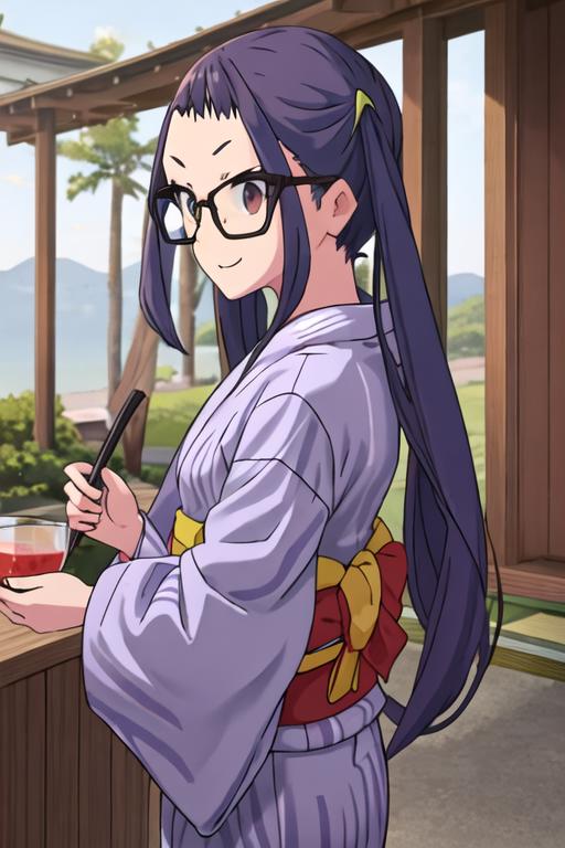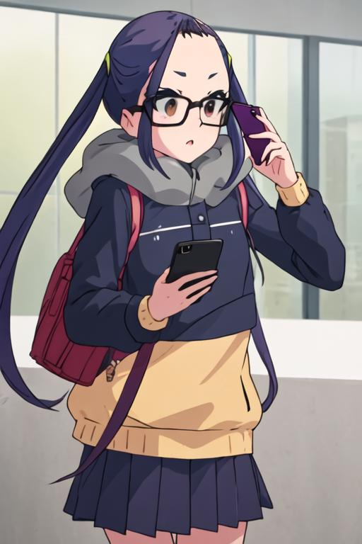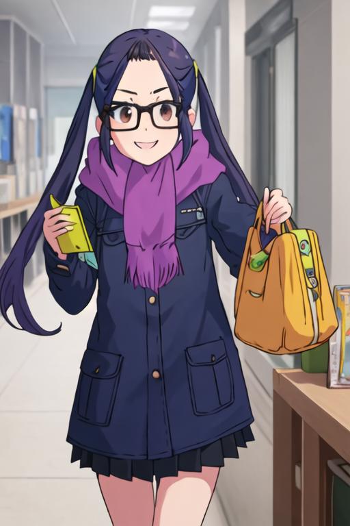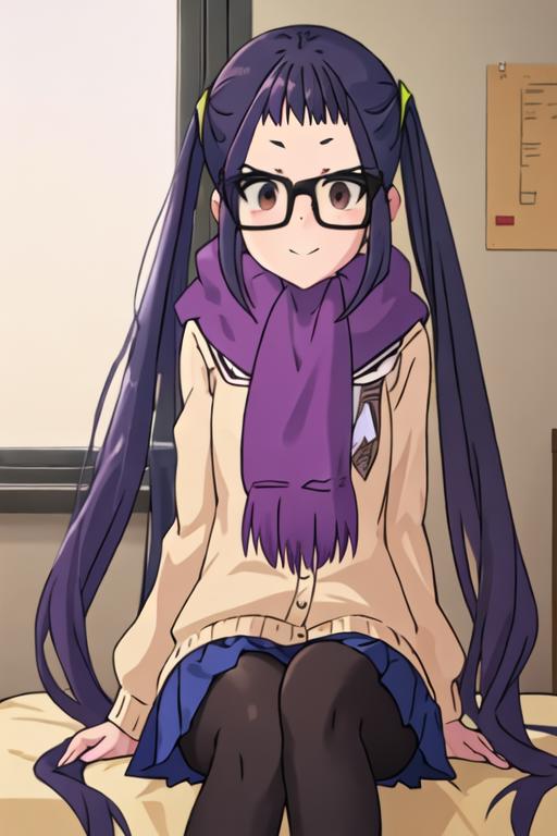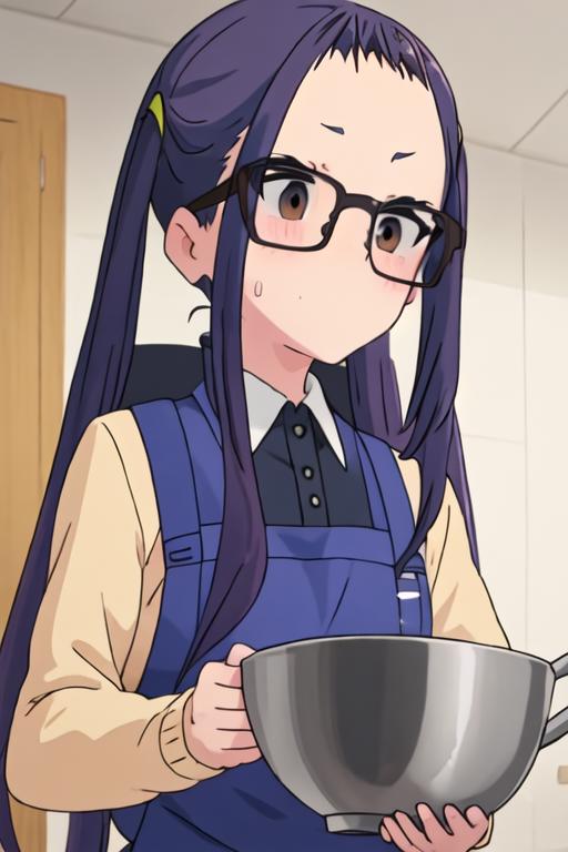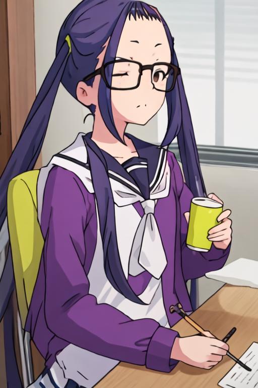 The trigger word is ogaki_chiaki_yurucamp, and the recommended tags are best quality, masterpiece, highres, solo, {ogaki_chiaki_yurucamp:1.15}, glasses, purple_hair, long_hair, brown_eyes, black-framed_eyewear, blue_hair.