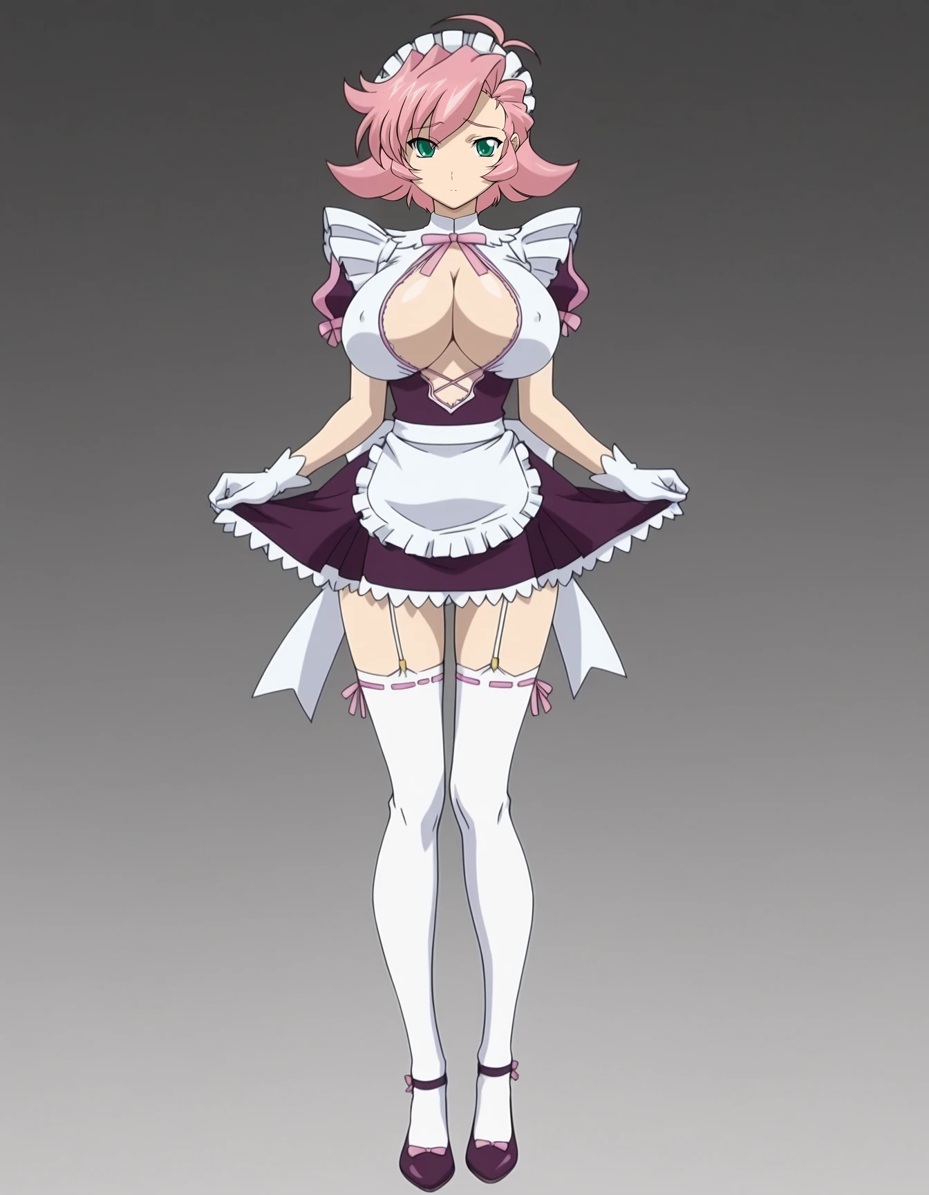 mai_asuna,short_hair,pink_hair,green_eyes,large_breasts,maid,maid_headdress,gloves,apron,thighhighs,white_shirt,center_opening