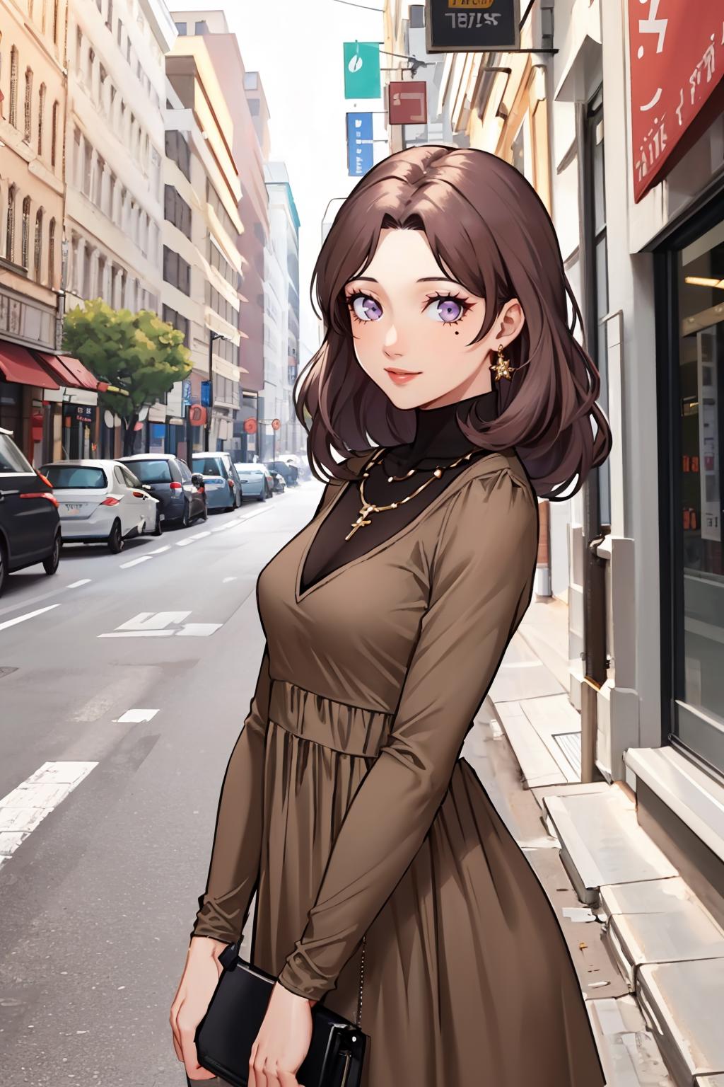 Casual Tags: saorip3, mole under eye, makeup, brown hair, purple eyes, saoricasual, brown dress, pantyhose, necklace