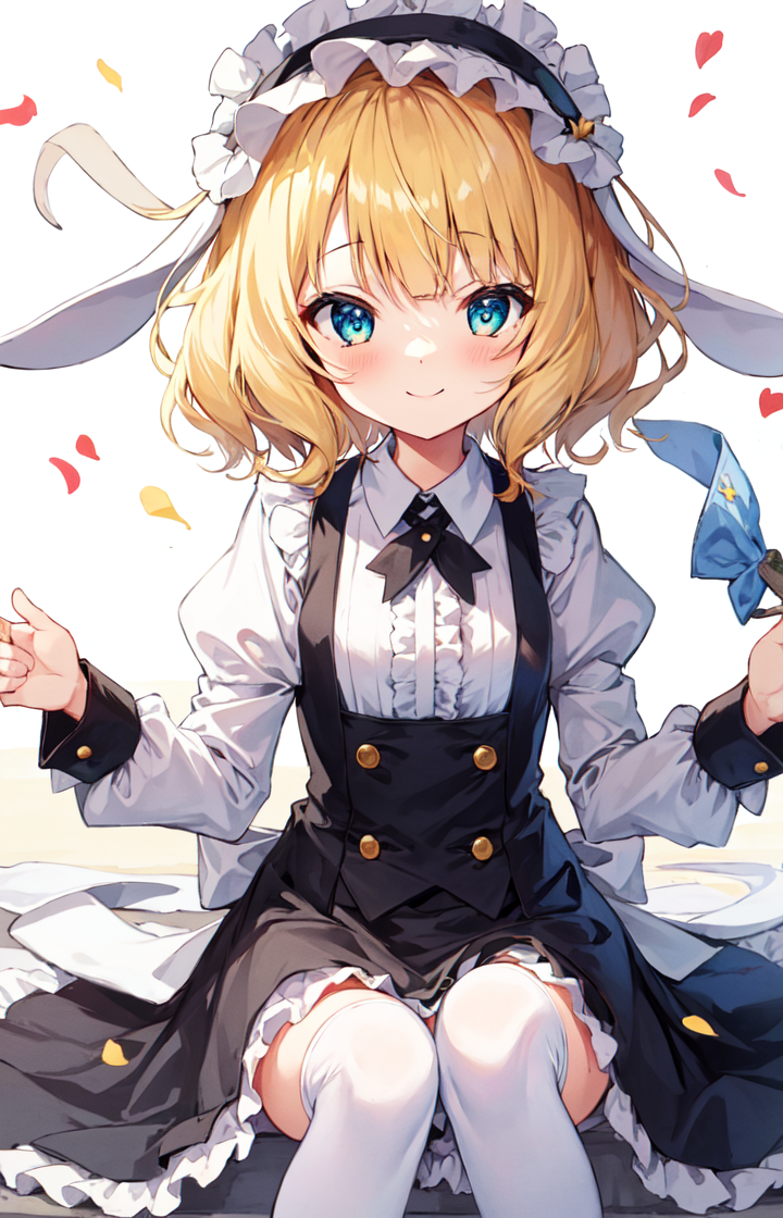• fleur de lapin uniform: fleur de lapin uniform, floppy ears, fake animal ears, puffy sleeves, frilled hairband, frilled apron, white thighhighs,