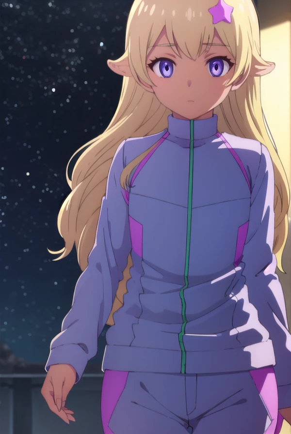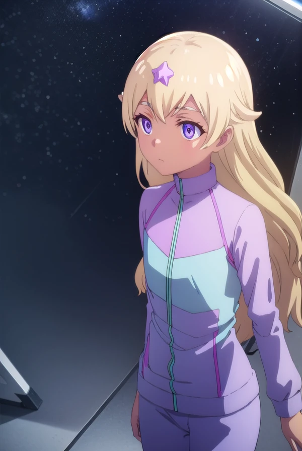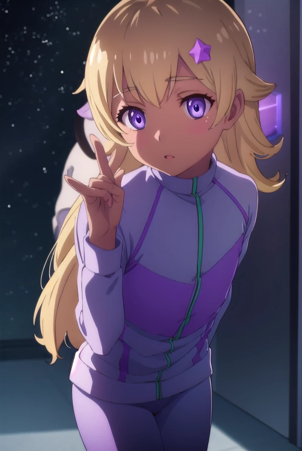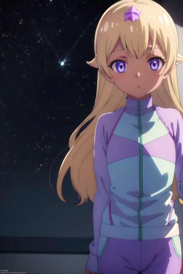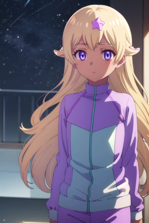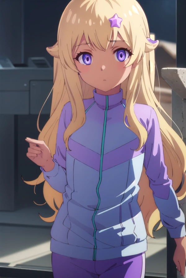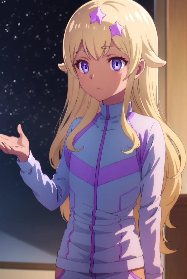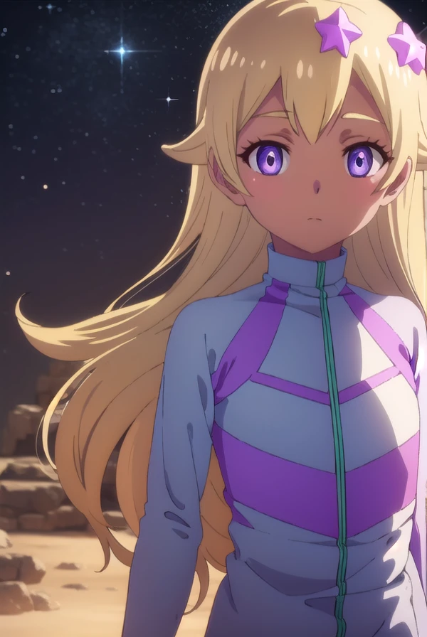 funicia raffaeli, long hair, blonde hair, hair ornament, (purple eyes:1.1), dark skin, star \(symbol\), dark-skinned female, star hair ornament,