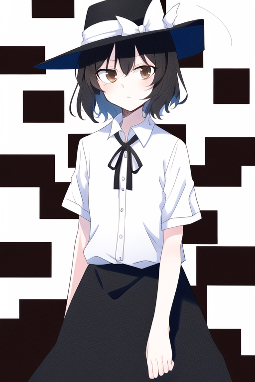 Try these promots:usami renko, touhou, brown eyes,short hair, black hair, black hat with white ribbon,white shirt,black skirt,