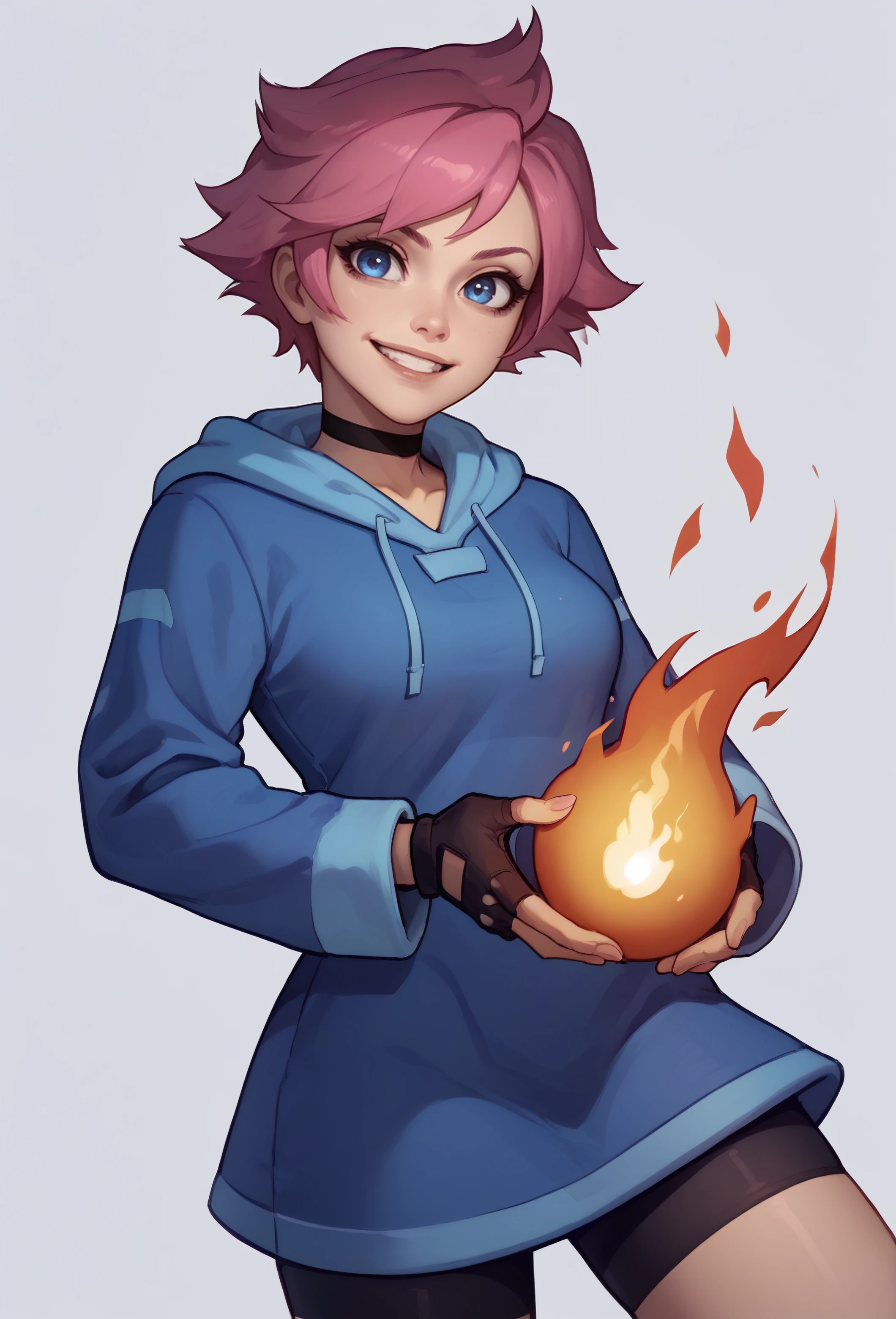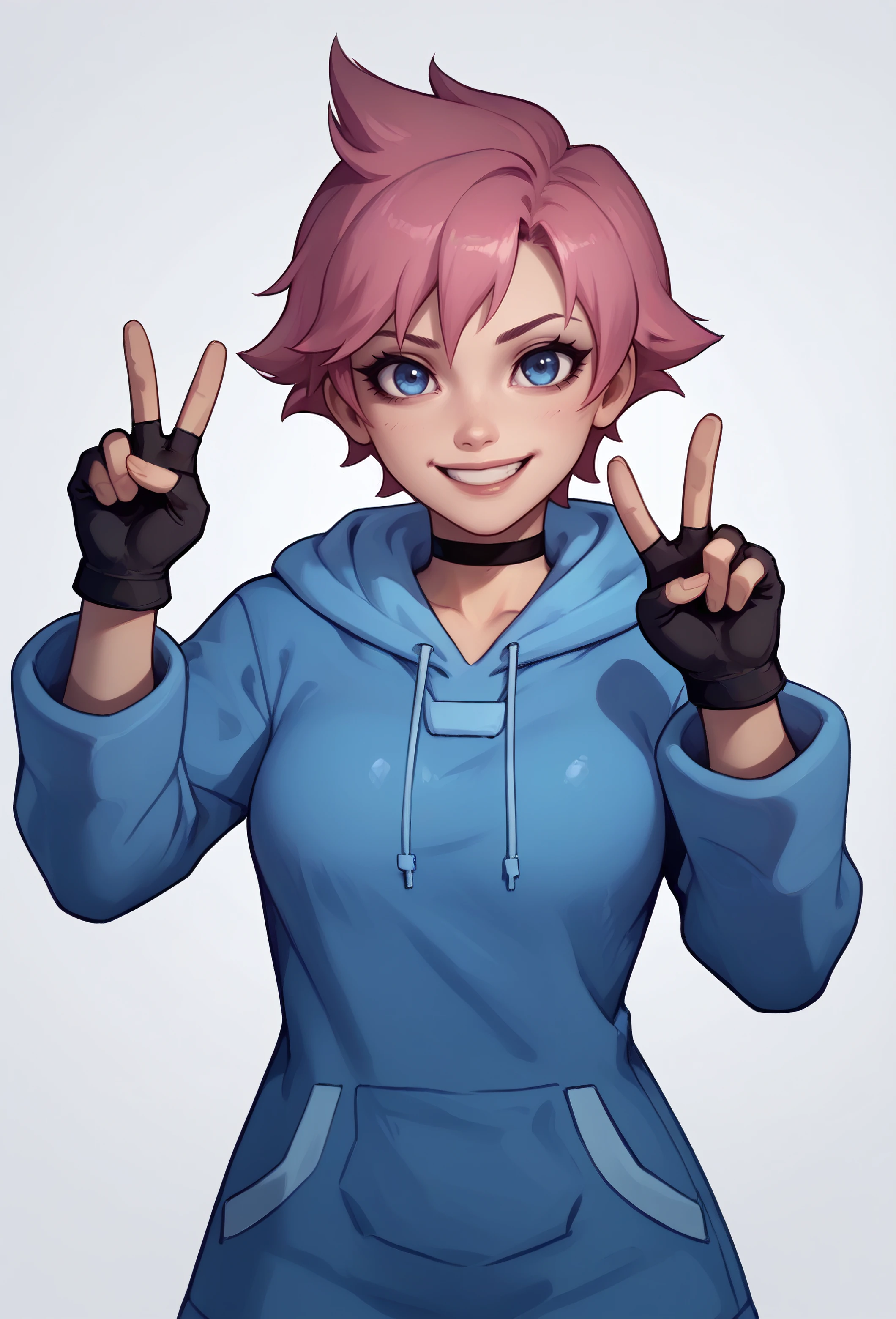 kumatora, 1girl, pink hair, short hair, blue eyes, blue hoodie, boots, long hoodie, black choker, fingerless gloves, spandex short