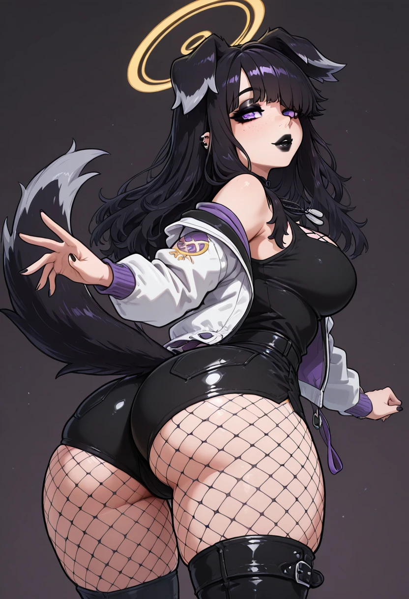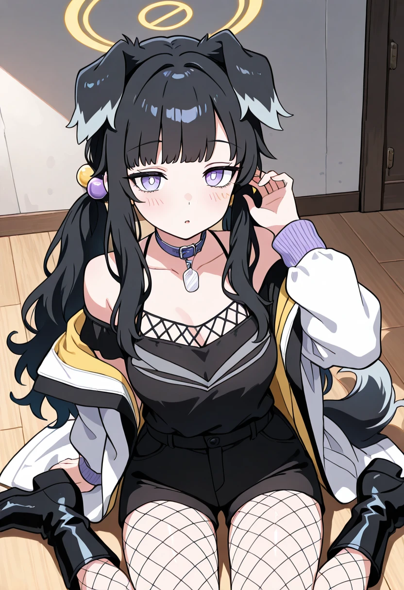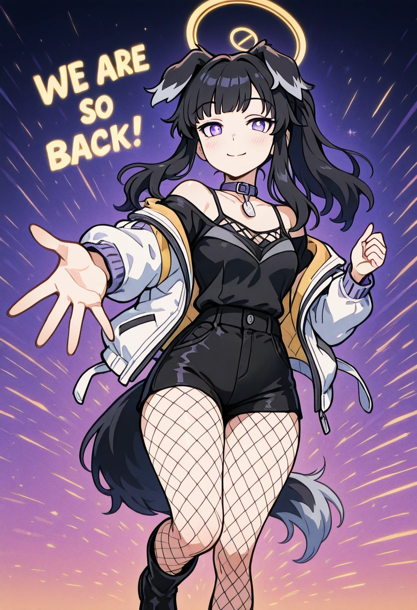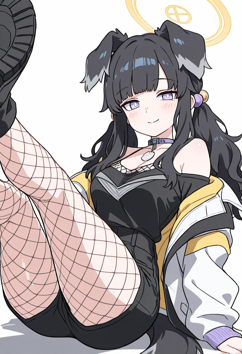 zzHibiki, purple eyes, black hair, long hair, animal ears, dog ears, dog tail, halo, black shirt, white jacket, open jacket, black shorts, boots, fishnet pantyhose, off-shoulder, dog tags,