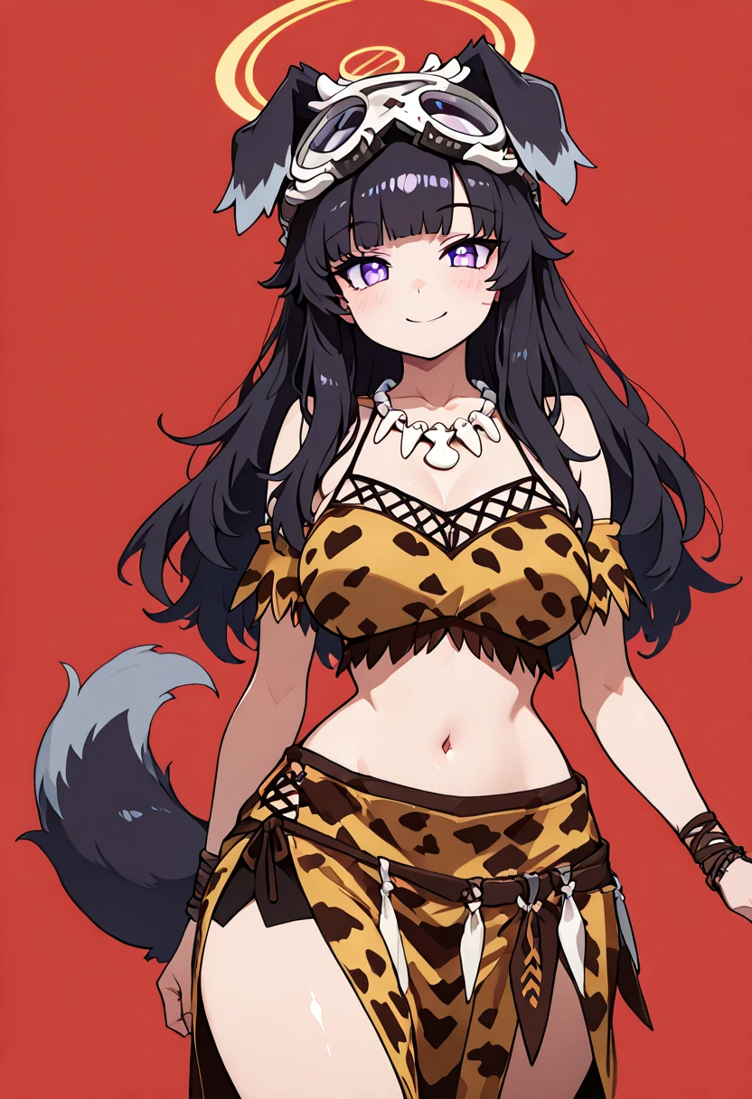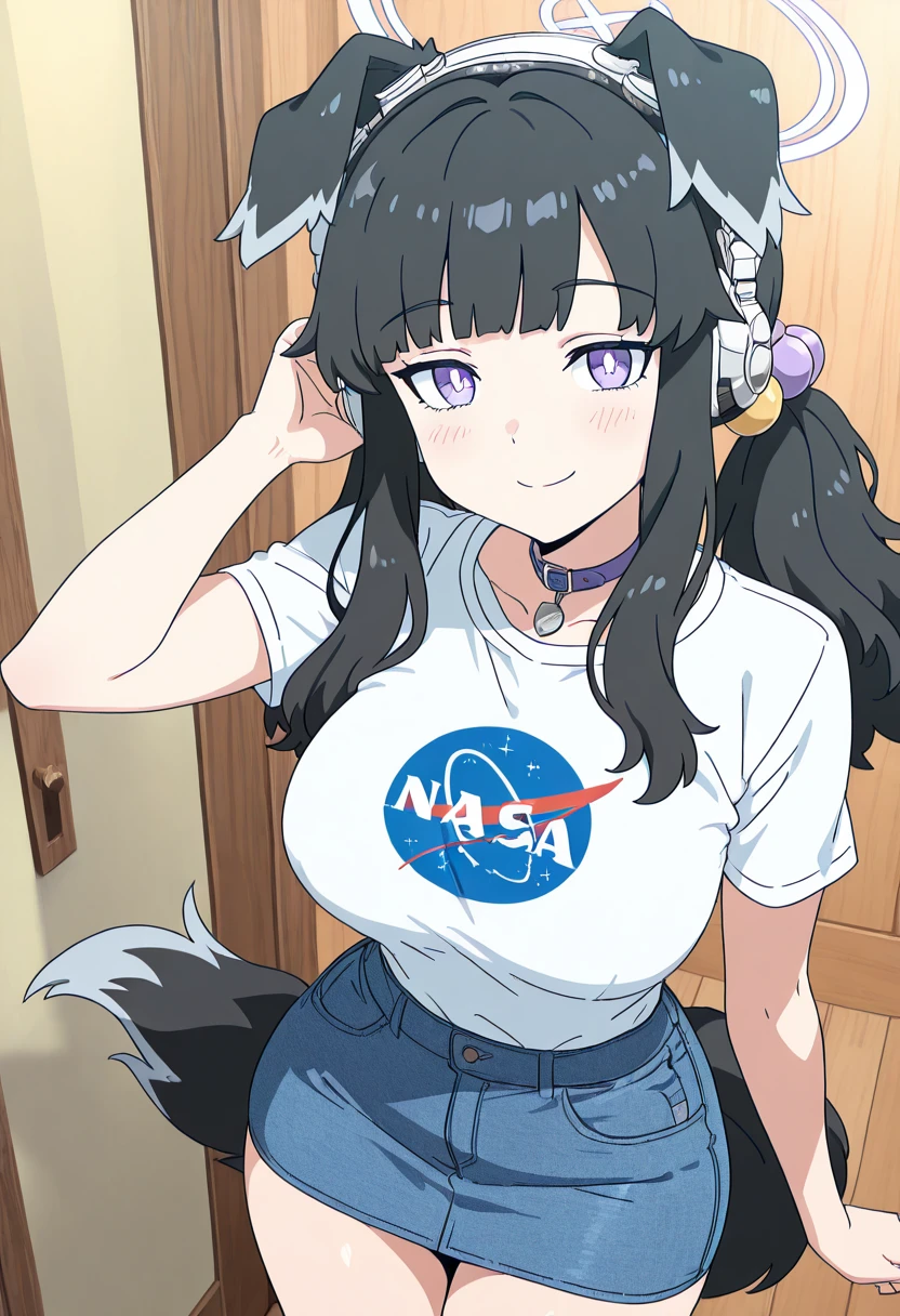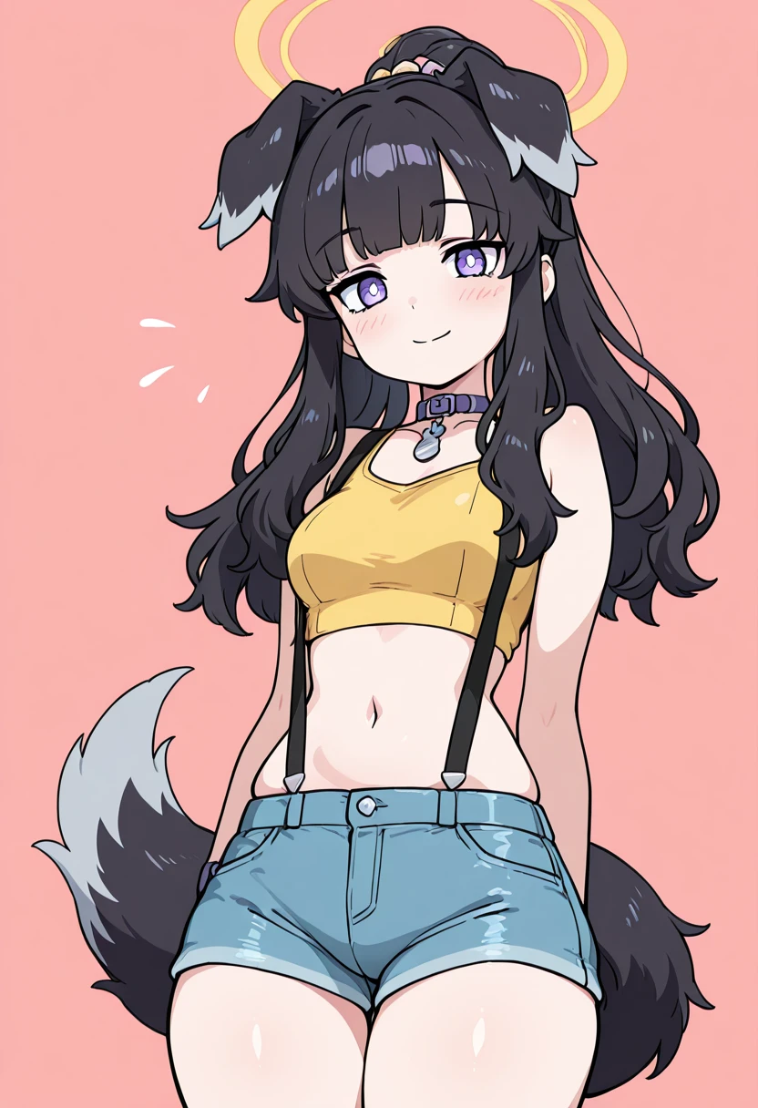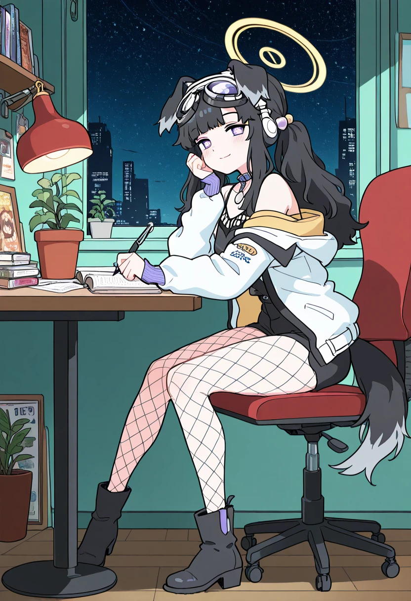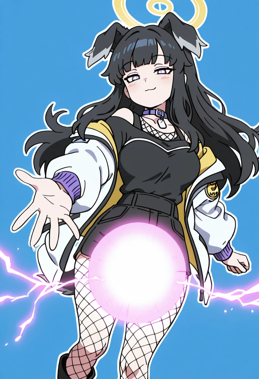 zzHibiki, purple eyes, black hair, long hair, animal ears, dog ears, dog tail, halo, black shirt, white jacket, open jacket, black shorts, boots, fishnet pantyhose, off-shoulder, dog tags,
