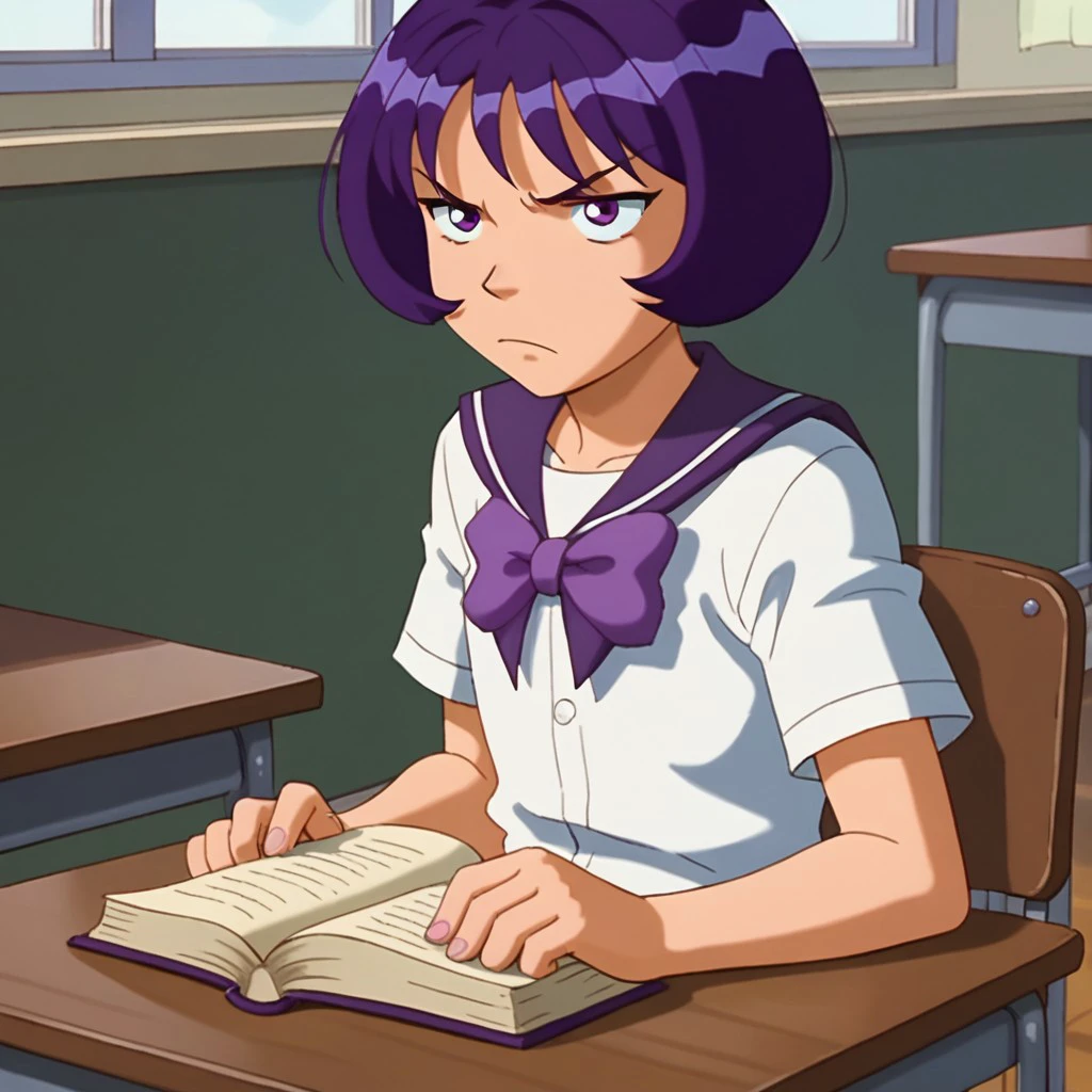 madison_ts. purple hair, short hair, purple eyes, school uniform, skirt, bow
