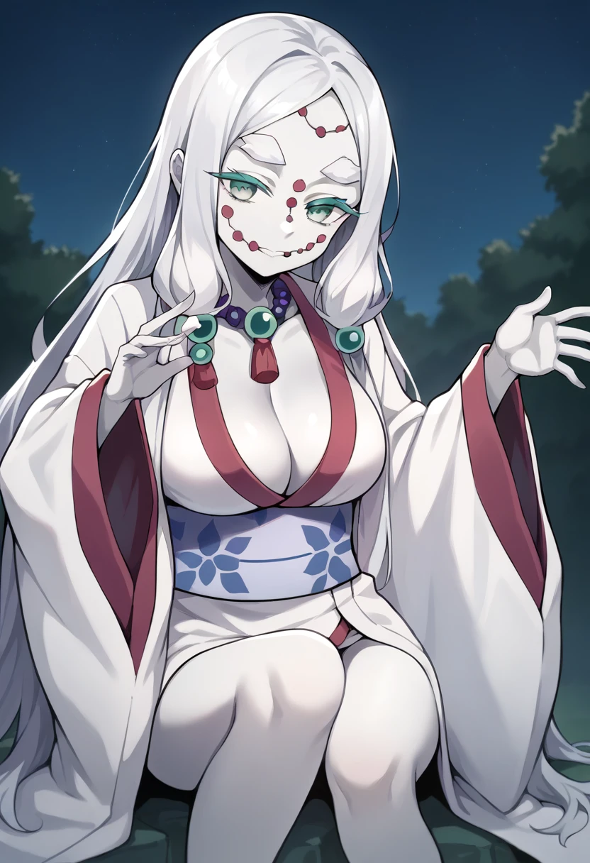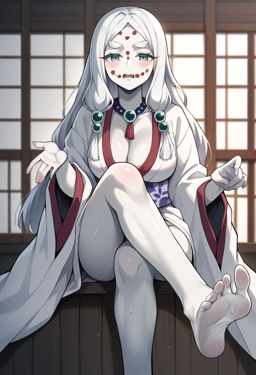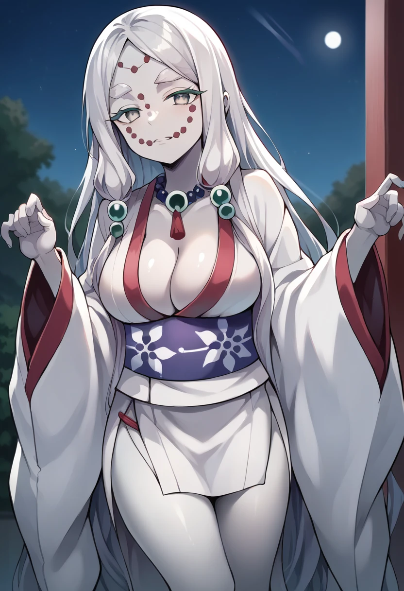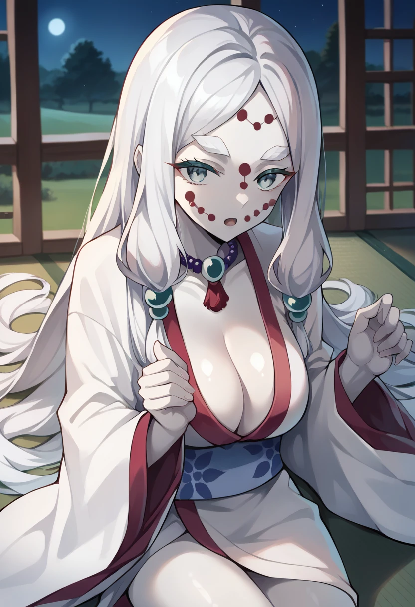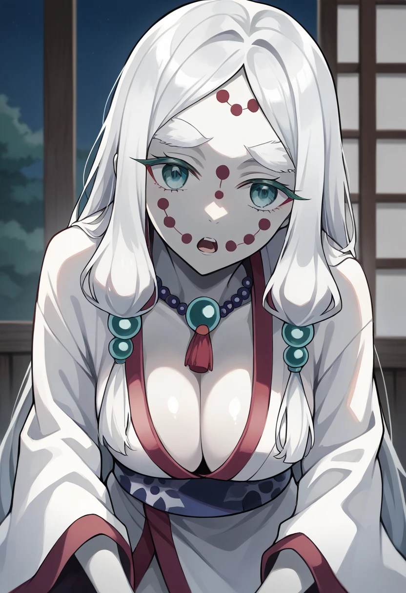 score_9, score_8_up, score_7_up, source_anime, masterpiece, 1girl, ct_m0th3r, white skin, large breasts, cleavage, bead necklace, white kimono, obi, long sleeves, wide sleeves, indoors, depth of field, looking at viewer, shiny skin,