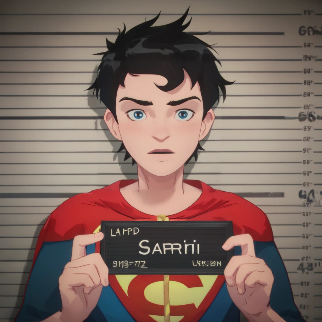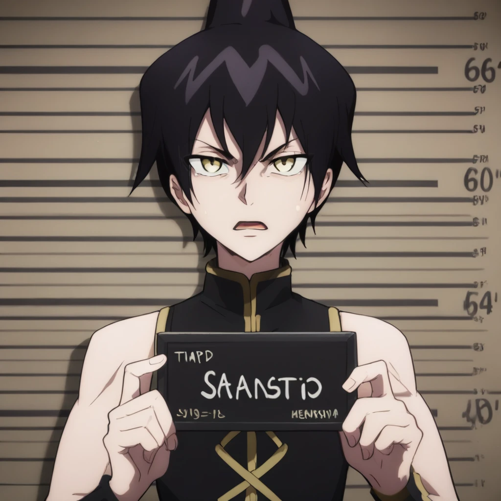 Barbie mugshot, holding, nameplate, holding sign, letterboxed, looking at viewer, mugshot, open mouth, upper body, english text,