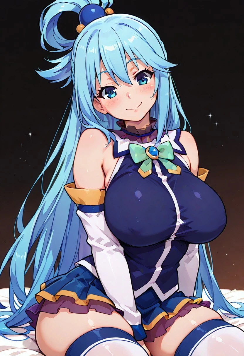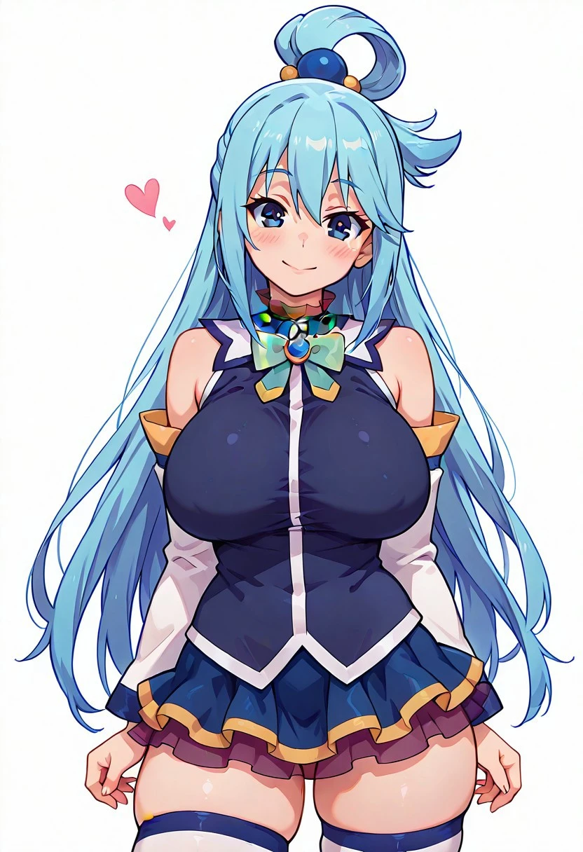 patAqua, aqua (konosuba), long hair, blue eyes, hair ornament, very long hair, blue hair, hair rings, single hair ring, hair bobbles, bare shoulders, detached sleeves, white thighhighs, blue skirt, blue shirt, green bow,