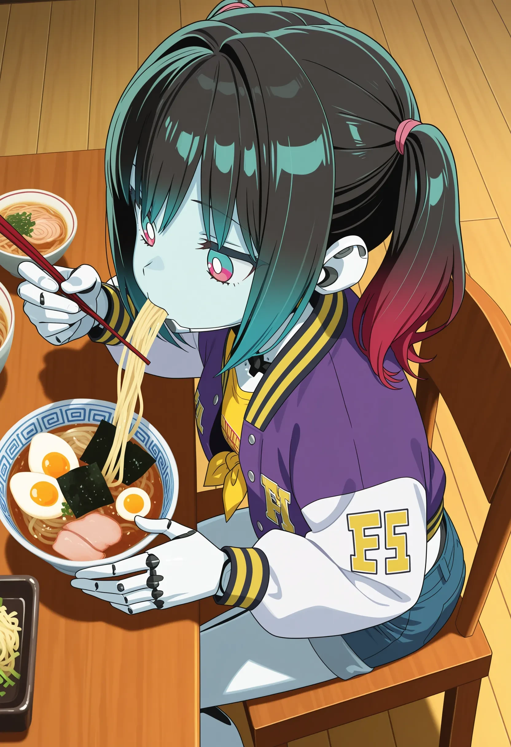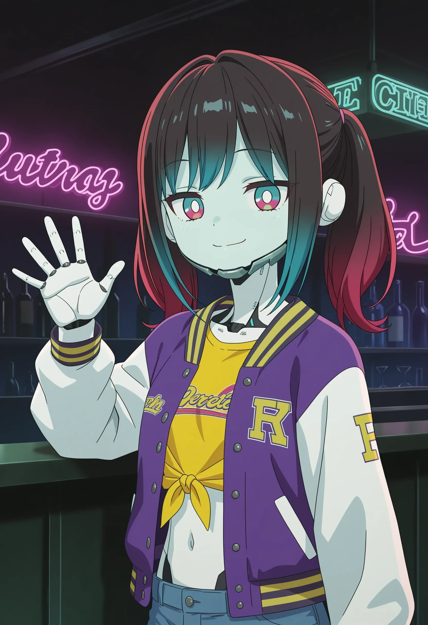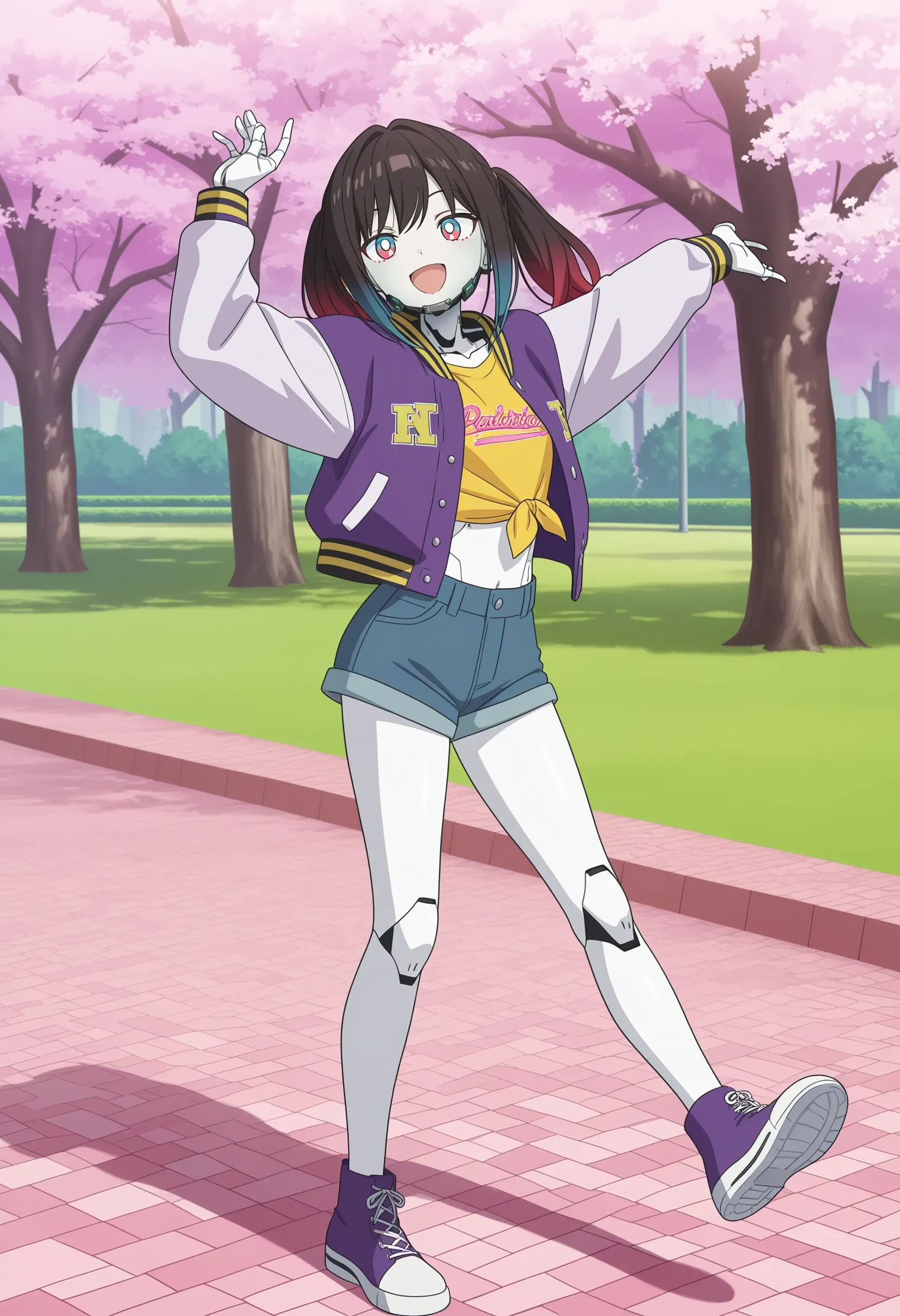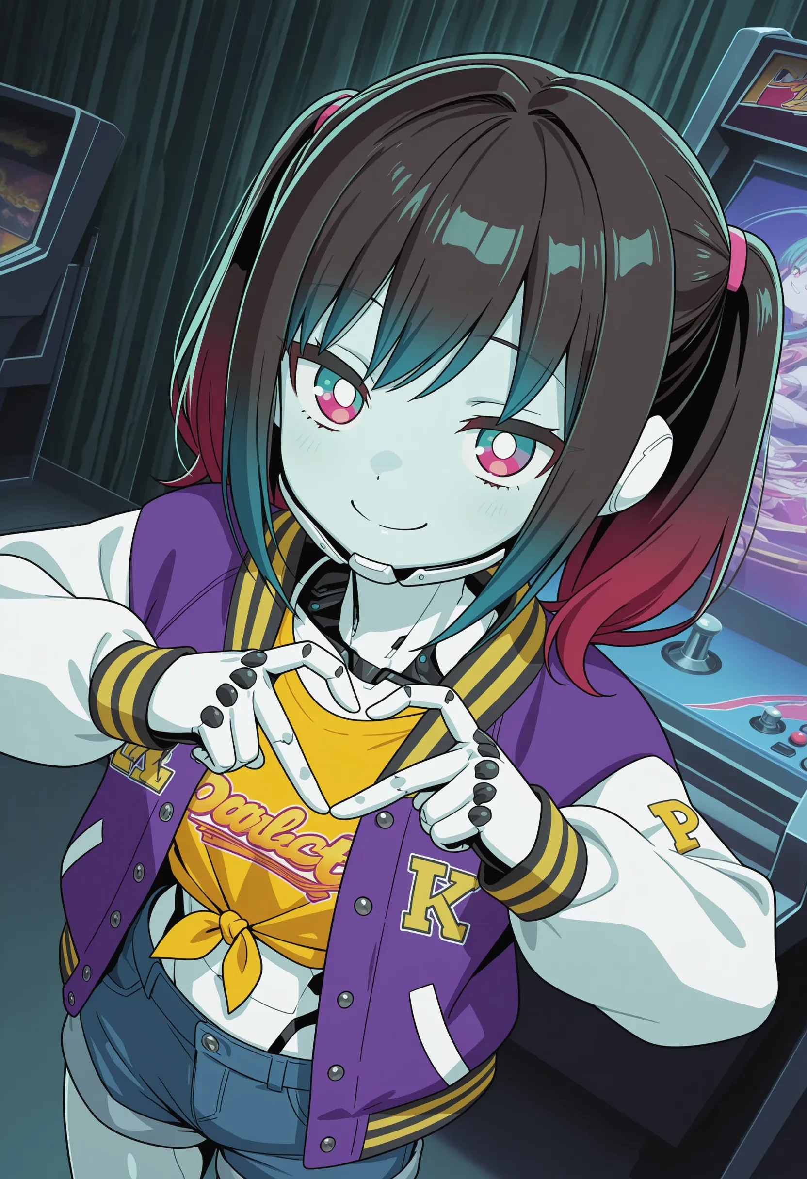 kurusu makina, cyborg, robot joints, gradient hair, twintails, black hair, red hair, blue hair, multicolored eyes, aqua and red eyes, white pupils, chin guard, purple letterman jacket, yellow shirt, tied shirt, crop top, denim shorts,