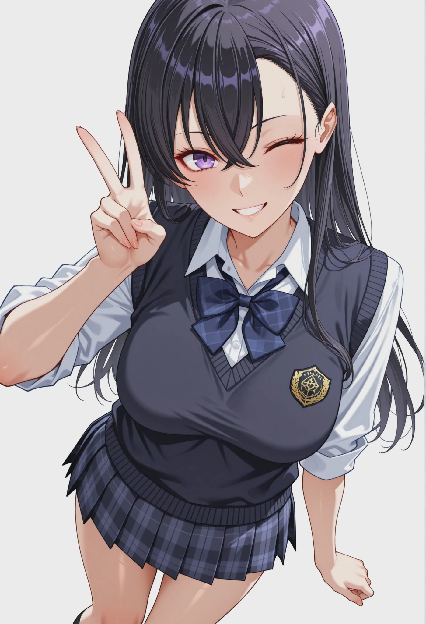 white collared shirt, blue bowtie, blue sweater vest, blue skirt, plaid skirt, black kneehighs,