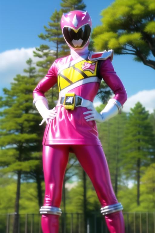 推荐tag:KyoryuPink, zyuden sentai kyoryuger, belt, gloves, helmet, pink bodysuit, pink skirt, white_gloves, realistic, solo,