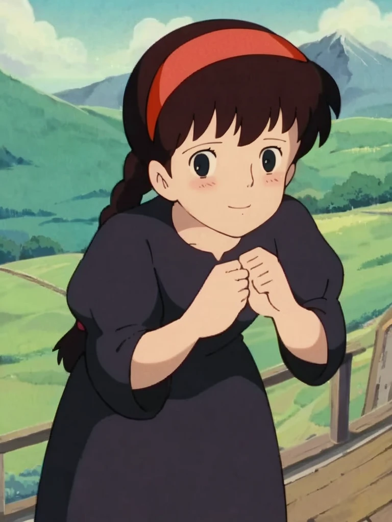 ,,single braid, hairband, pink pants, short sleeves, yellow shirt, brown hair,, retro artstyle, anime_screencap