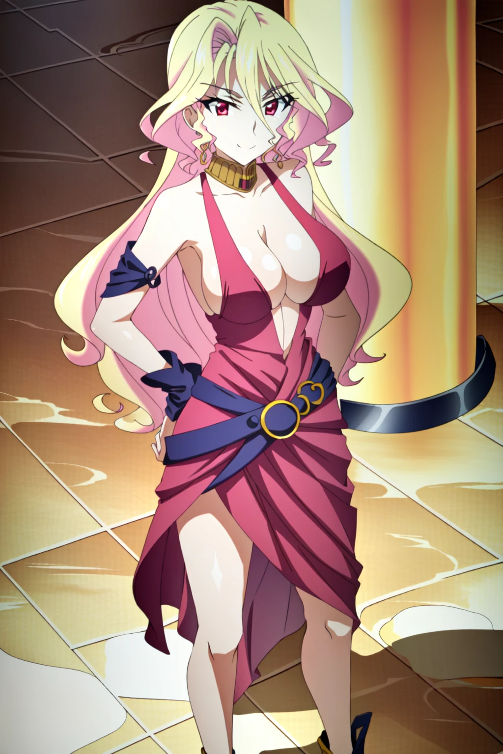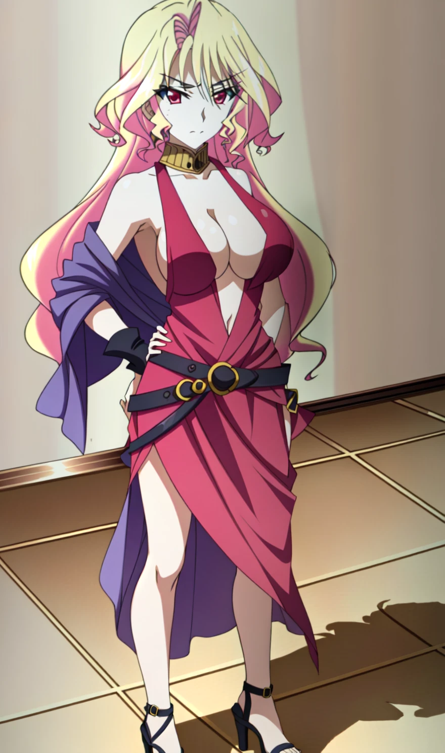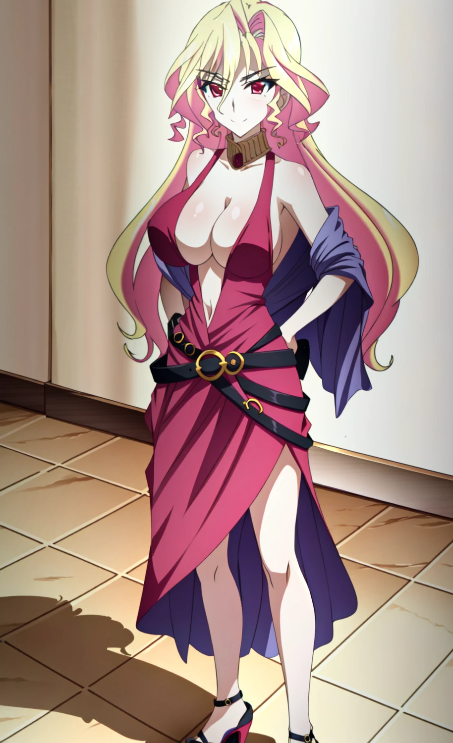 Squall Meusel, 1girl, blonde hair, red eyes, solo, breasts, long hair, dress, cleavage, high heels, hand on hip, medium breasts, belt
