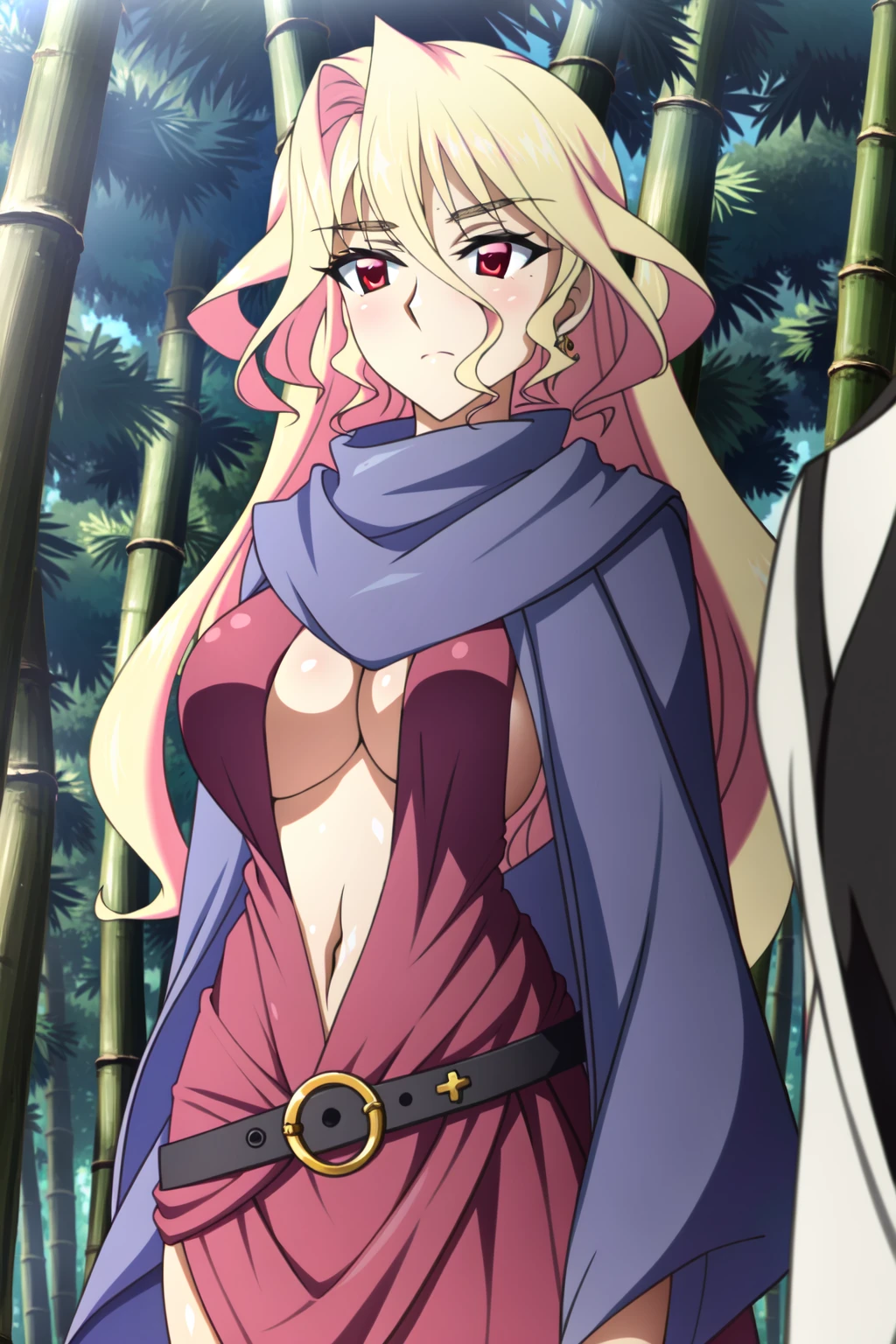 Squall Meusel, 1girl, solo, blonde hair, long hair, breasts, red eyes, center opening, cleavage, cape, navel, large breasts, belt, staff, dress