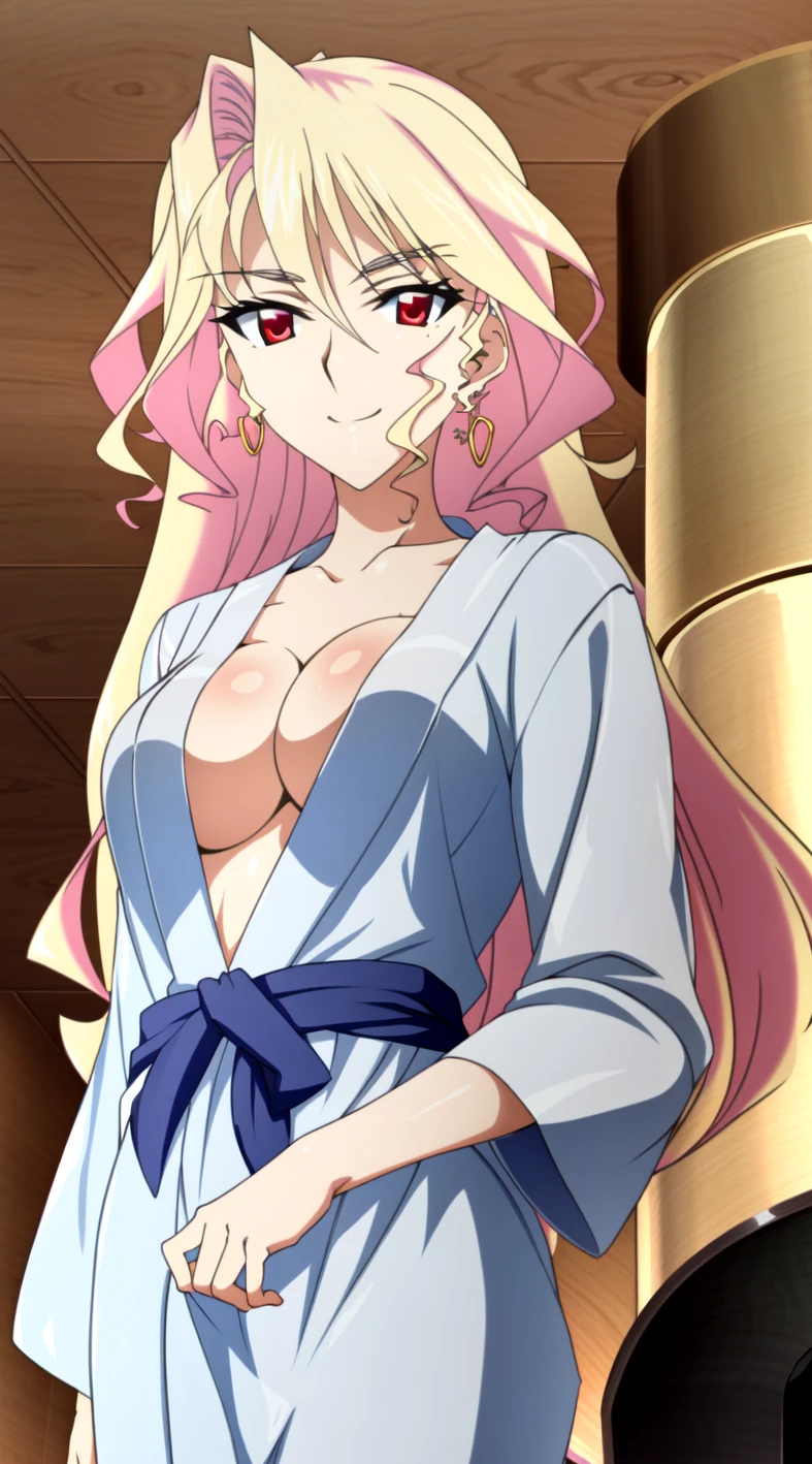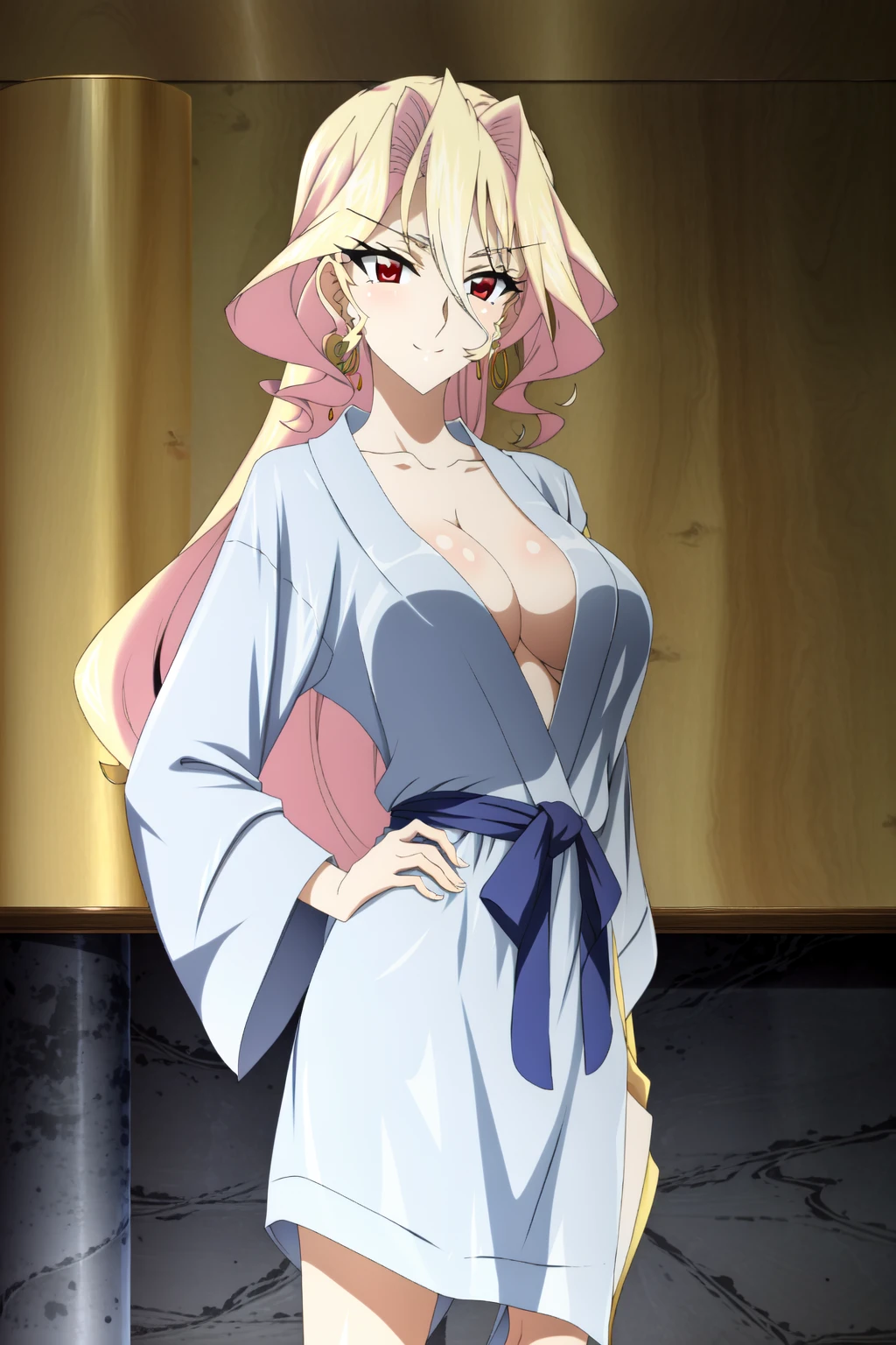 Squall Meusel, 1girl, solo, breasts, blonde hair, long hair, bathrobe, cleavage, hand on hip, red eyes, medium breasts, smile, robe, jewelry, earrings