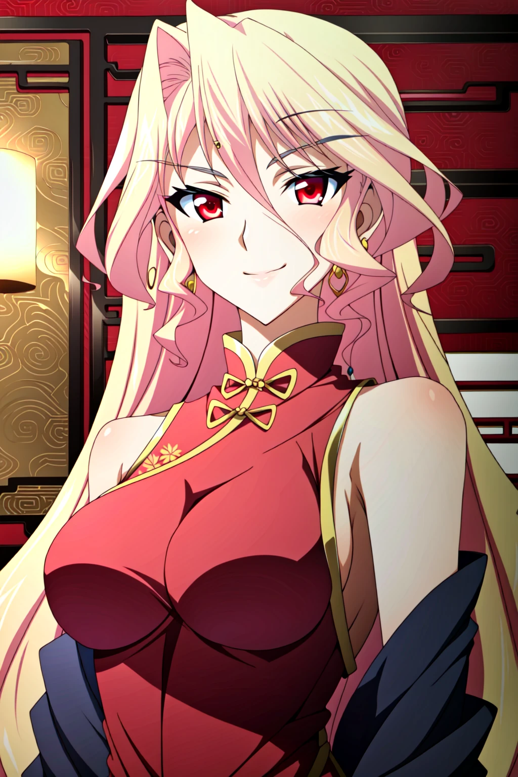 Squall Meusel, 1girl, breasts, solo, jewelry, long hair, earrings, blonde hair, red eyes, cleavage, dress, large breasts, choker, looking at viewer, upper body, smile, bare shoulders, hoop earrings, closed mouth