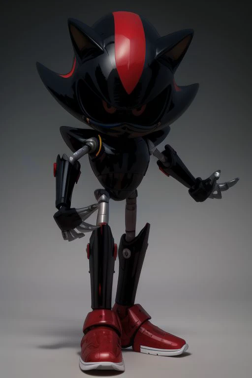 Prompt: Metal Shadow, black robot, red streaks, metal limbs, black sclera, red pupils, claws, black and red shoes