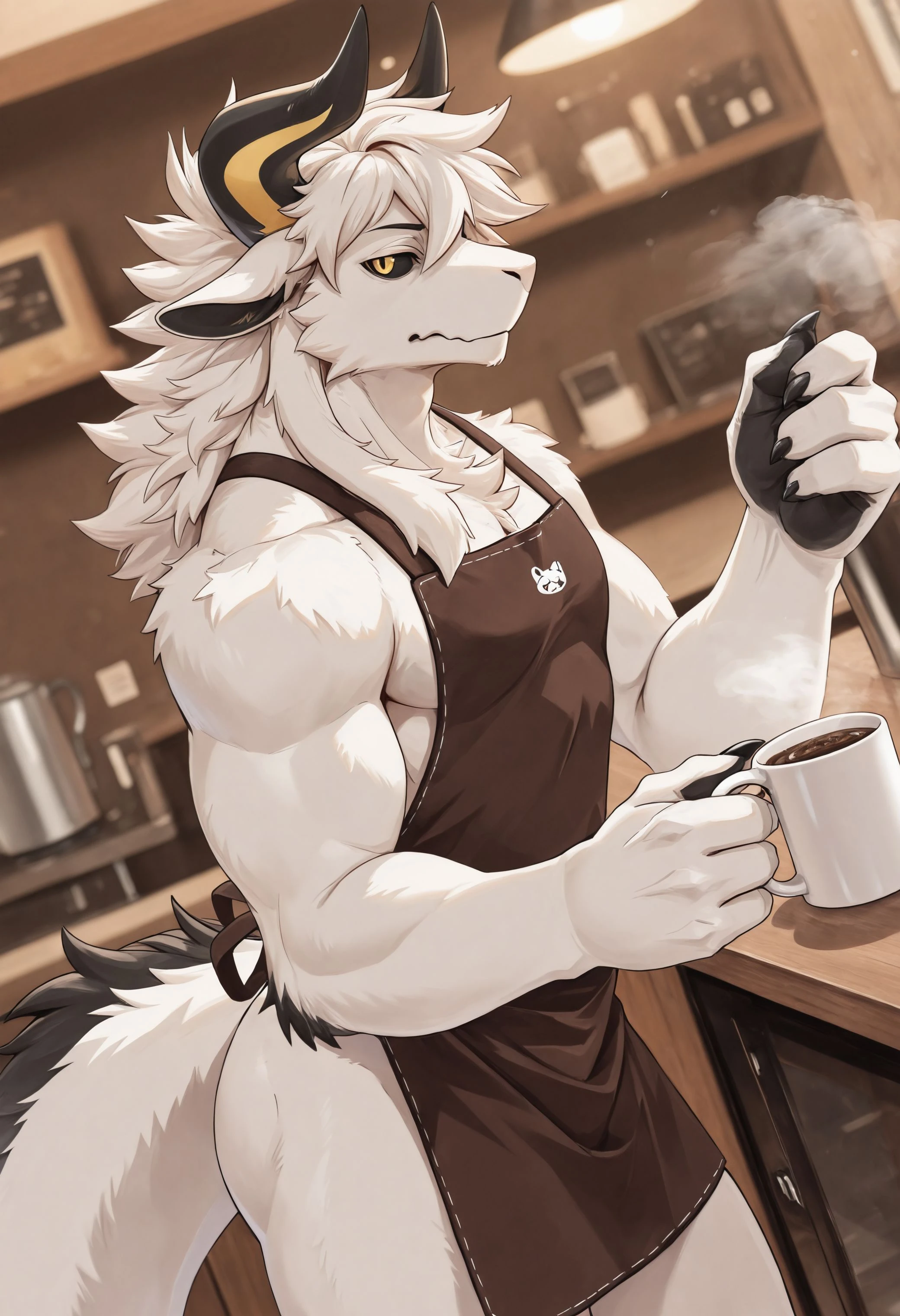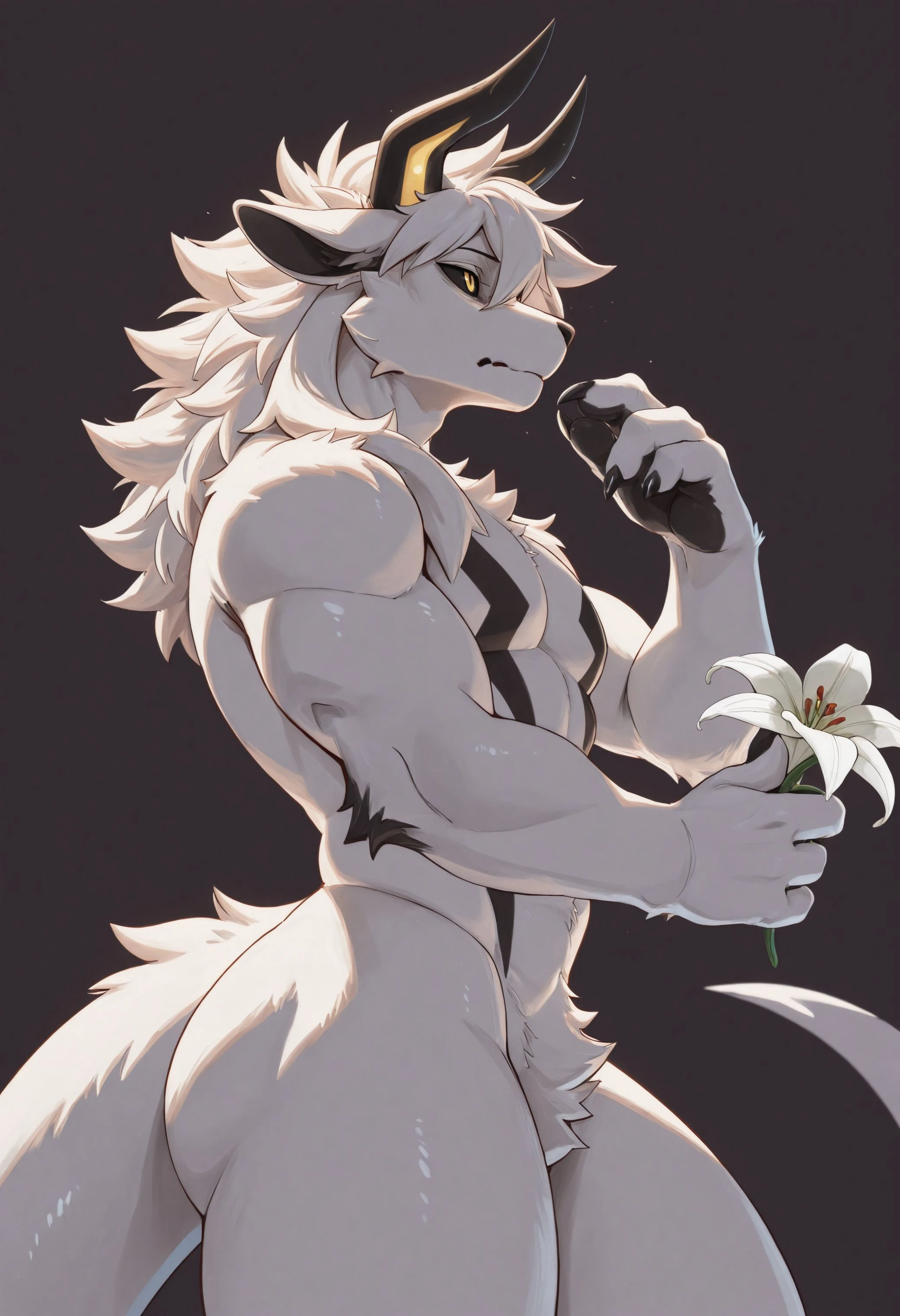 3n30s, 3nt1ty305, anthro, furry, furry male, bara, solo, 1boy, horns, white body, yellow eyes, black sclera