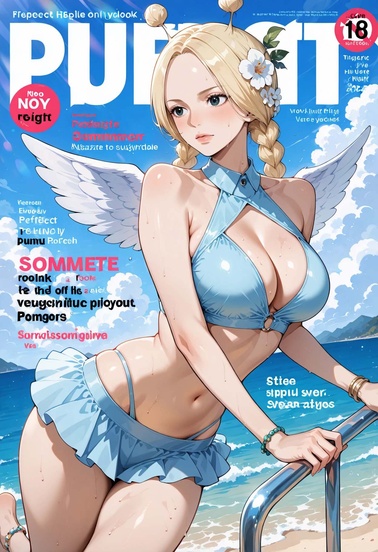Alternative Outfit: hair flower,hair ornament,wings,white wings,breasts,bikini,swimsuit,large breasts,jewelry,bracelet,anklet,bikini skirt,skirt,cleavage cutout,barefoot,miniskirt,halterneck,blue skirt,clothing cutout