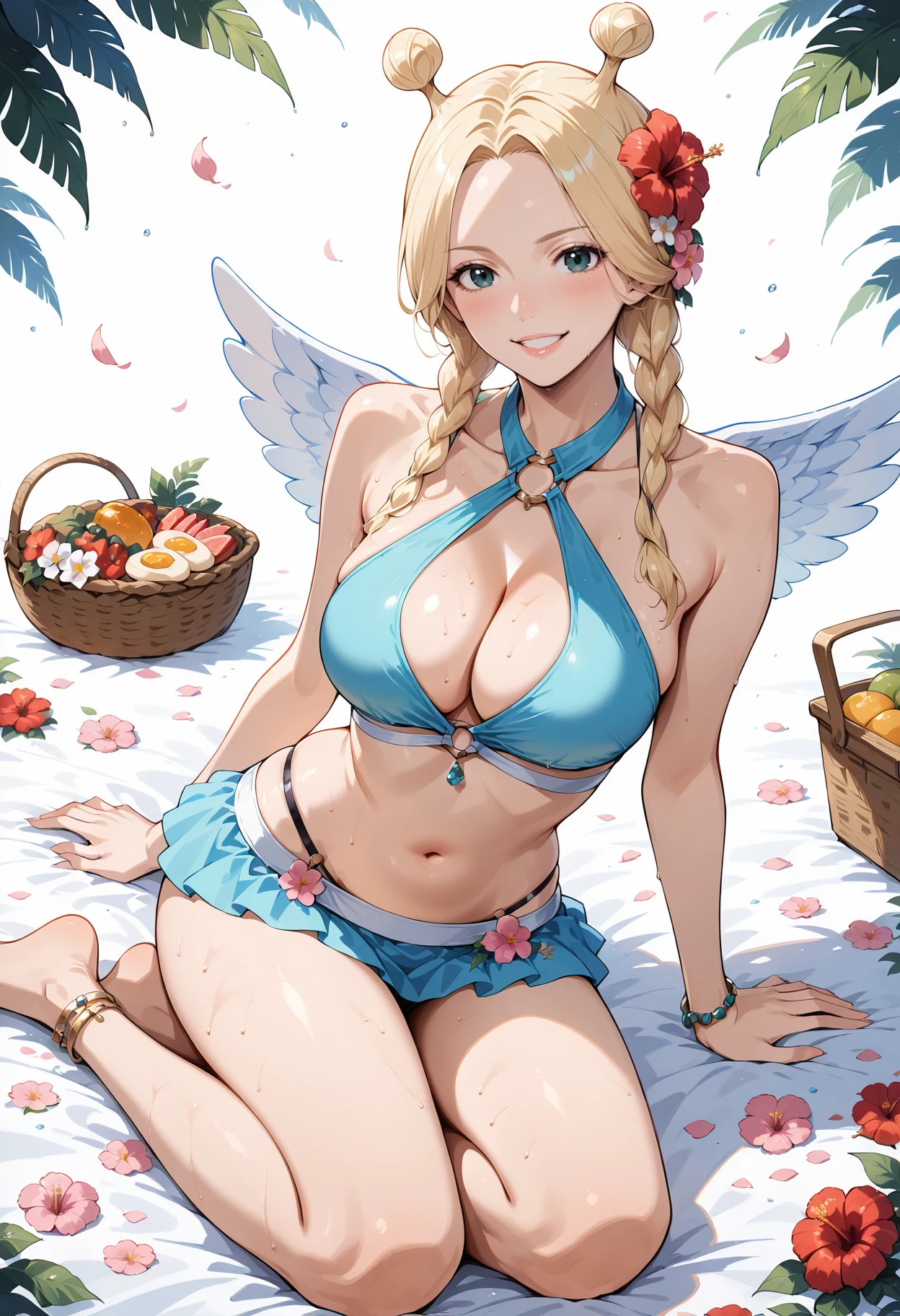 hair flower,hair ornament,wings,white wings,breasts,bikini,swimsuit,large breasts,jewelry,bracelet,anklet,bikini skirt,skirt,cleavage cutout,barefoot,miniskirt,halterneck,blue skirt,clothing cutout