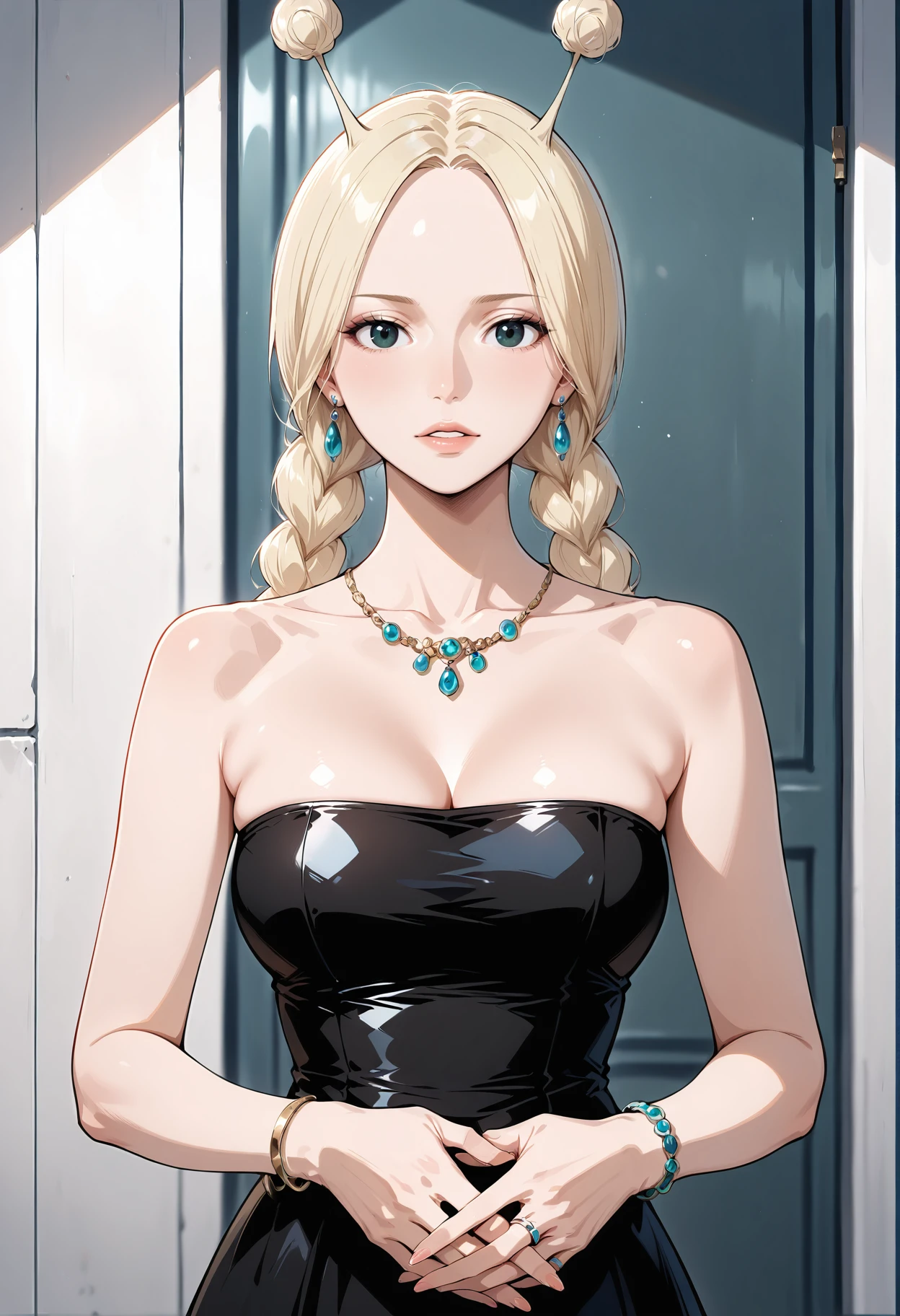 1girl,green eyes,black eyes,blue eyes,blonde hair,hair bun,long hair,braid,single hair bun,twintails,twin braids,antennae