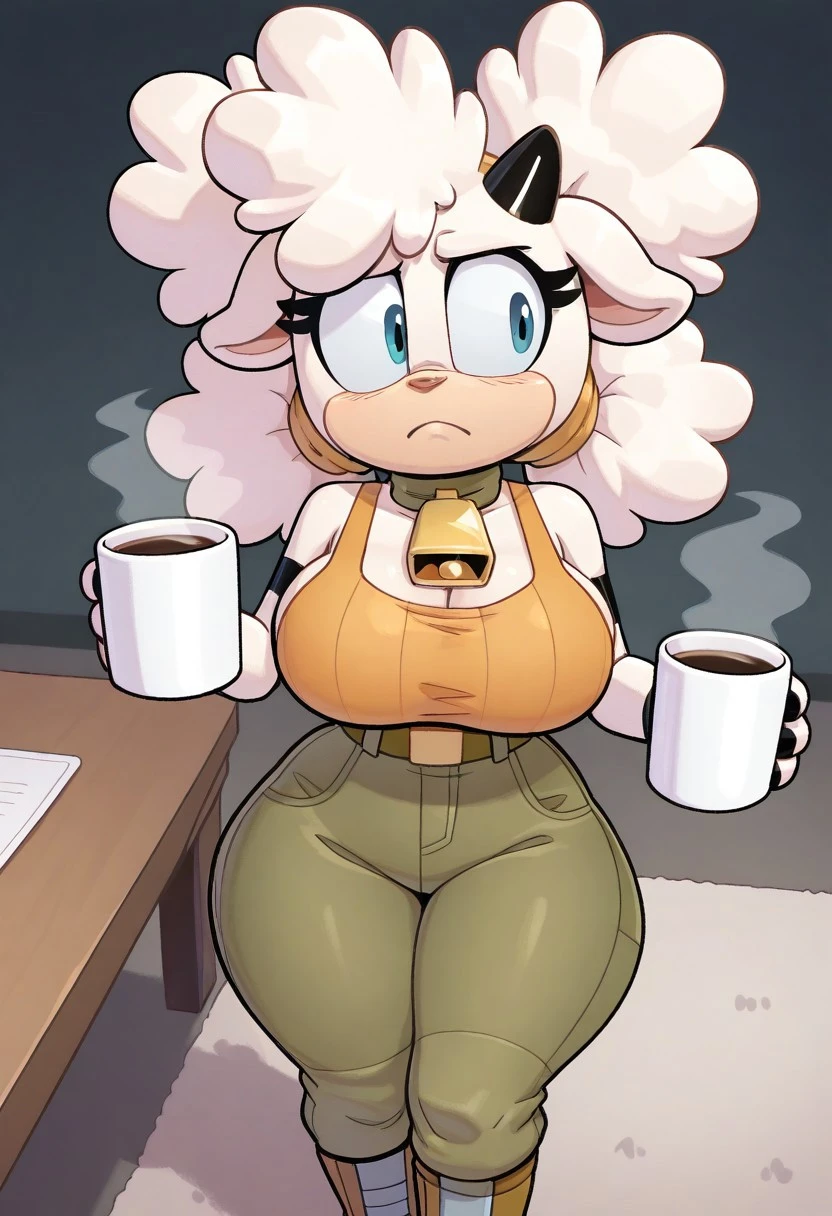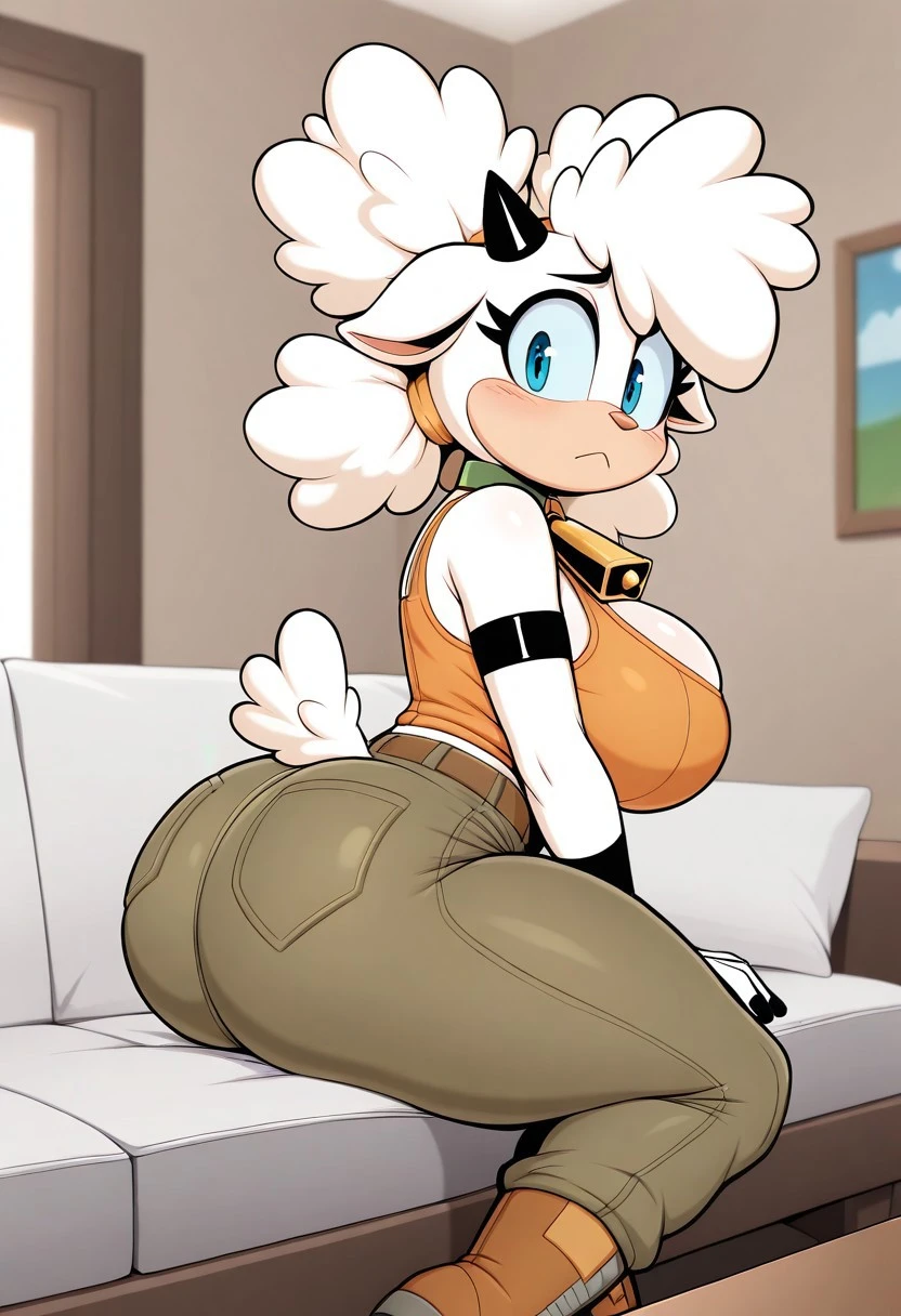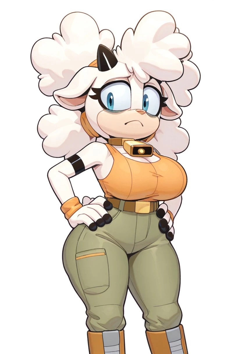 Lanolin the Sheep, white skin, white Afro hair, blue eyes, black horns, cowbell choker, black nails, orange tank top, brown belt, brown pants, brown boots