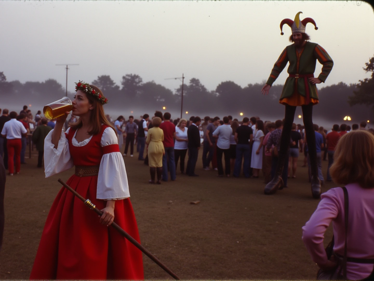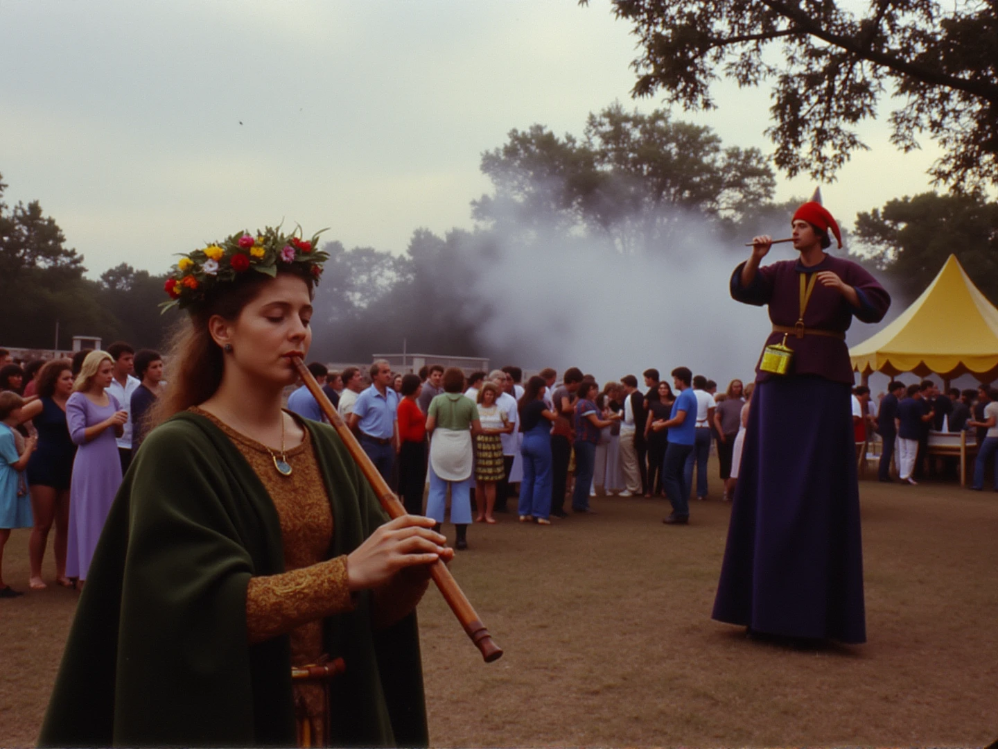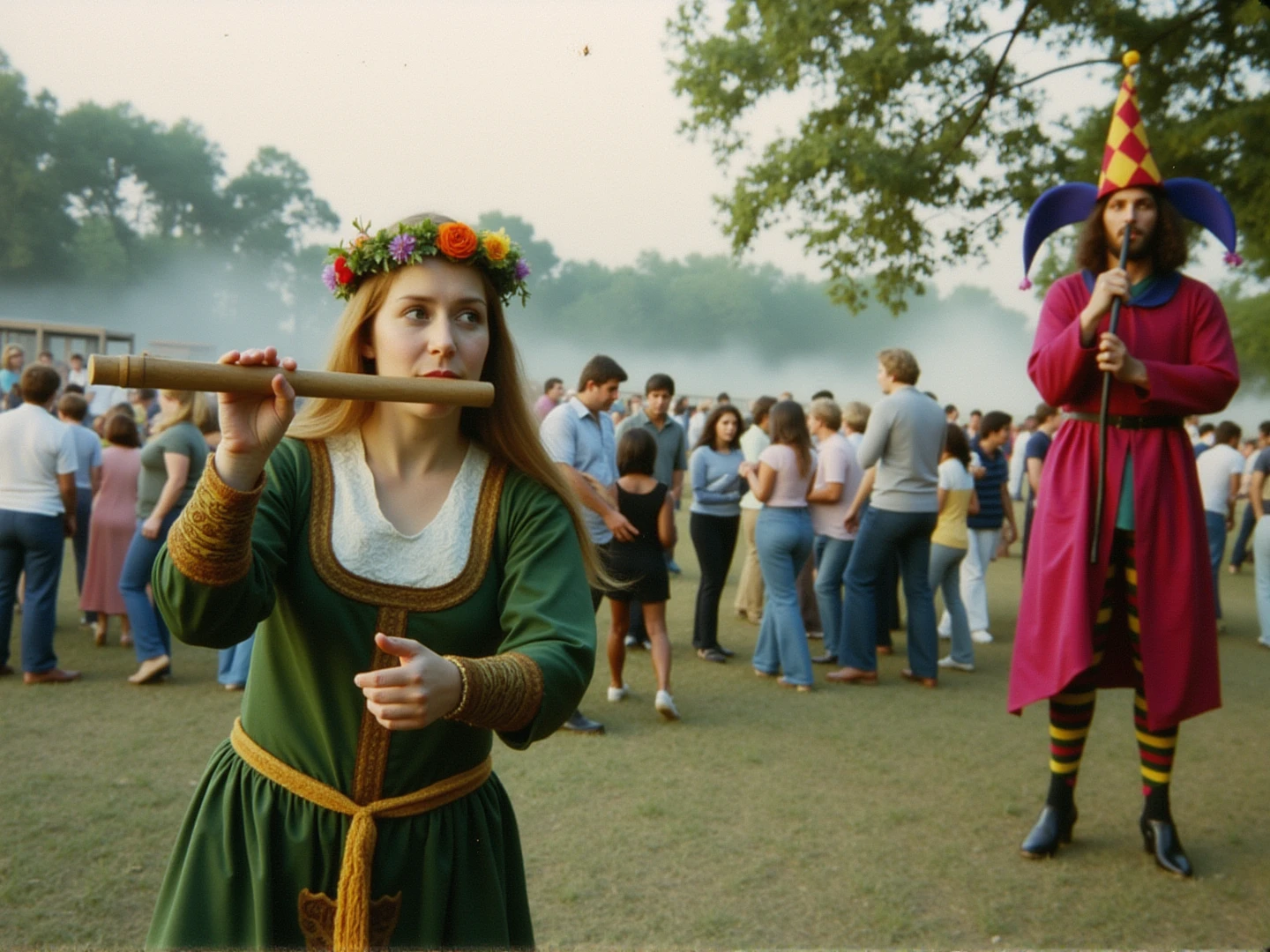 r3nf41r a crowd of people in medieval costumes in 1980, a woman in a medieval dress and a crown of flowers is playing a wooden flute, a man on stilts in a jester hat in background, photo from 1981 renaissance festival at dusk, mist, Kodak instant camera.Conjure the very specific, simple time when the Texas Renaissance Fair had just started up outside of Houston, Texas.