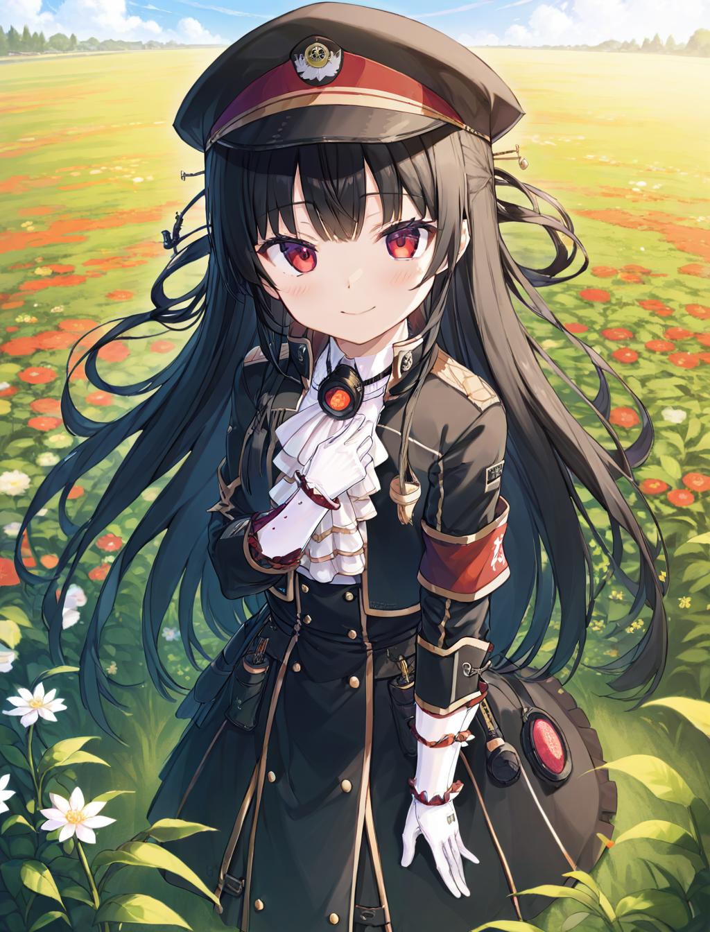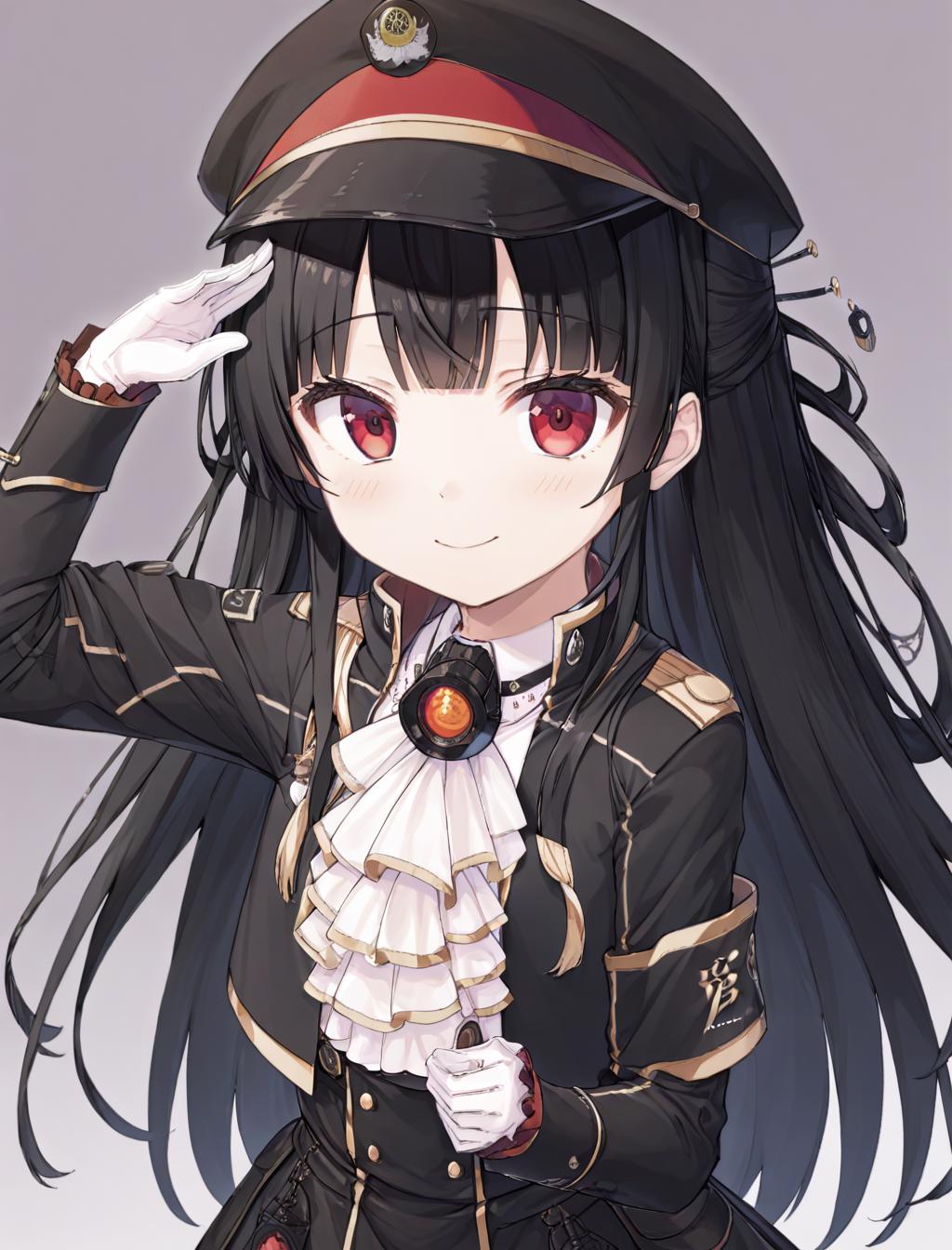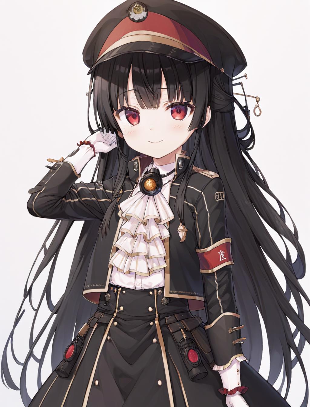 官方服装提示词:8620 \(uniform\),peaked cap,white gloves,black jacket,black skirt,black headwear,white ascot,armband,frills,black boots,