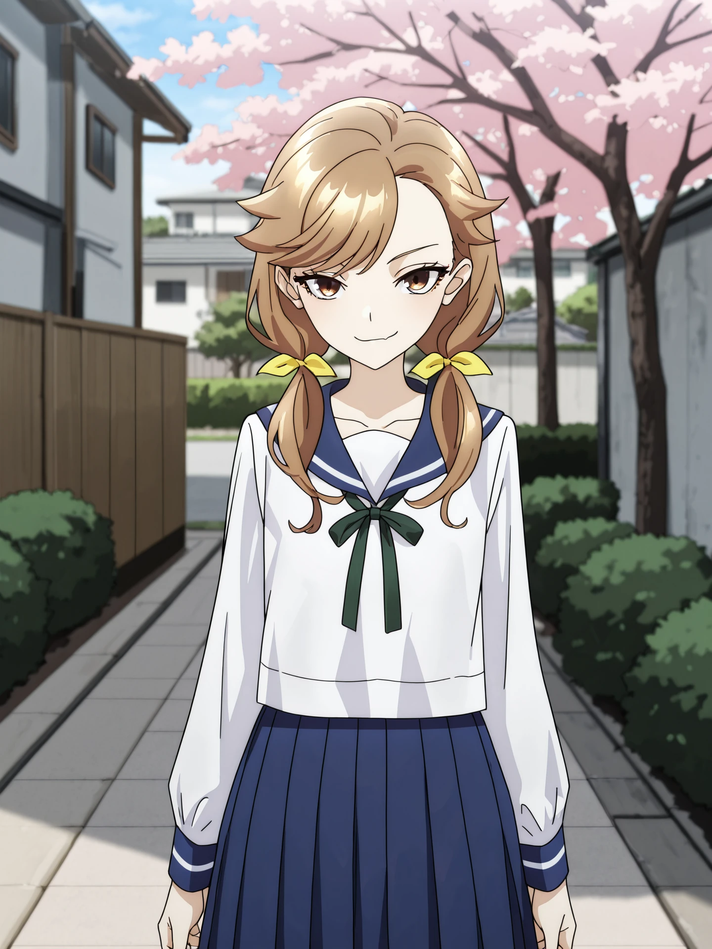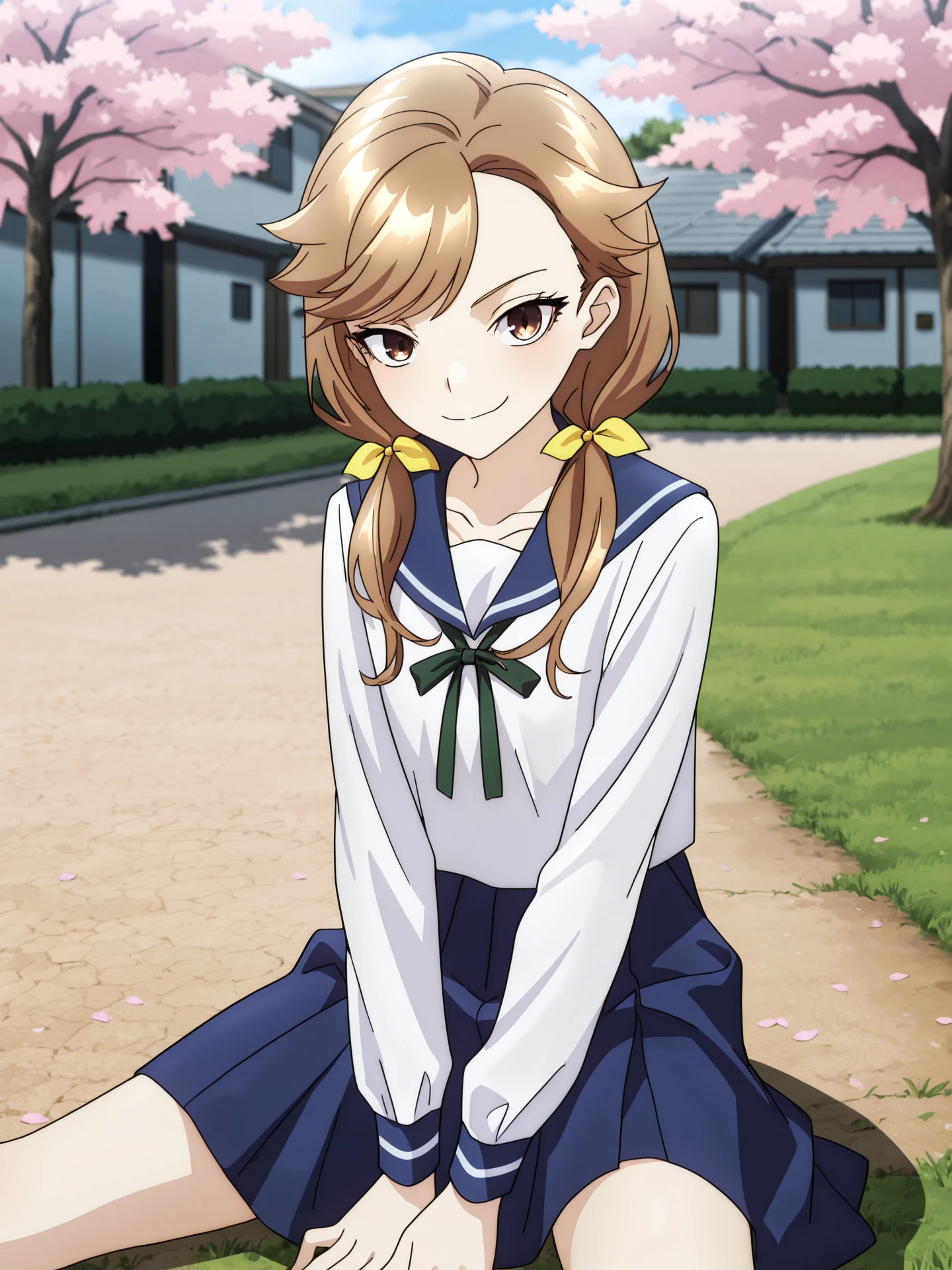 Prompts: tenjousora, brown eyes, brown hair, long hair, asymmetrical hair, asymmetrical bangs, low twintails, hair ribbon serafuku, white shirt, blue sailor collar, neck ribbon, long sleeves, blue skirt