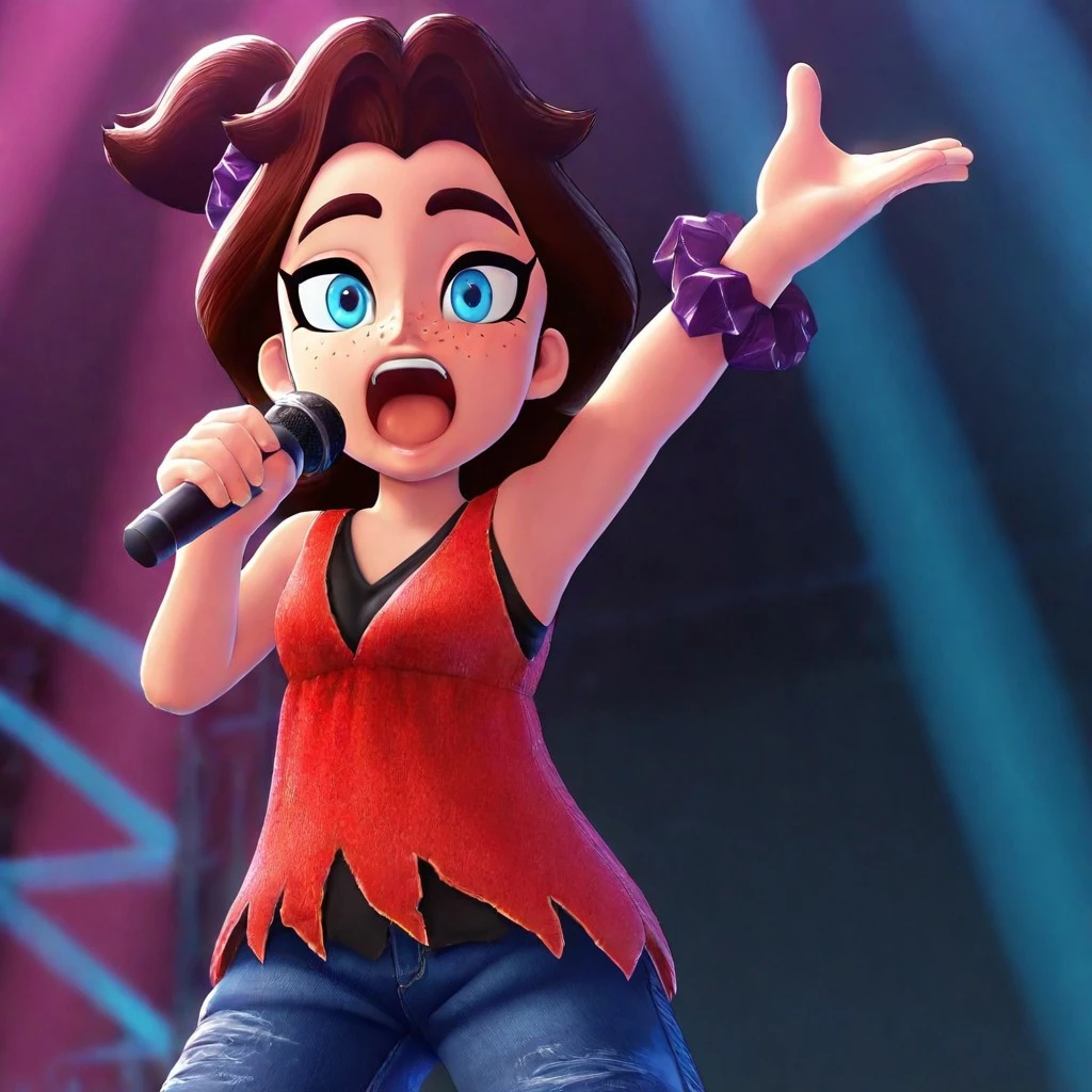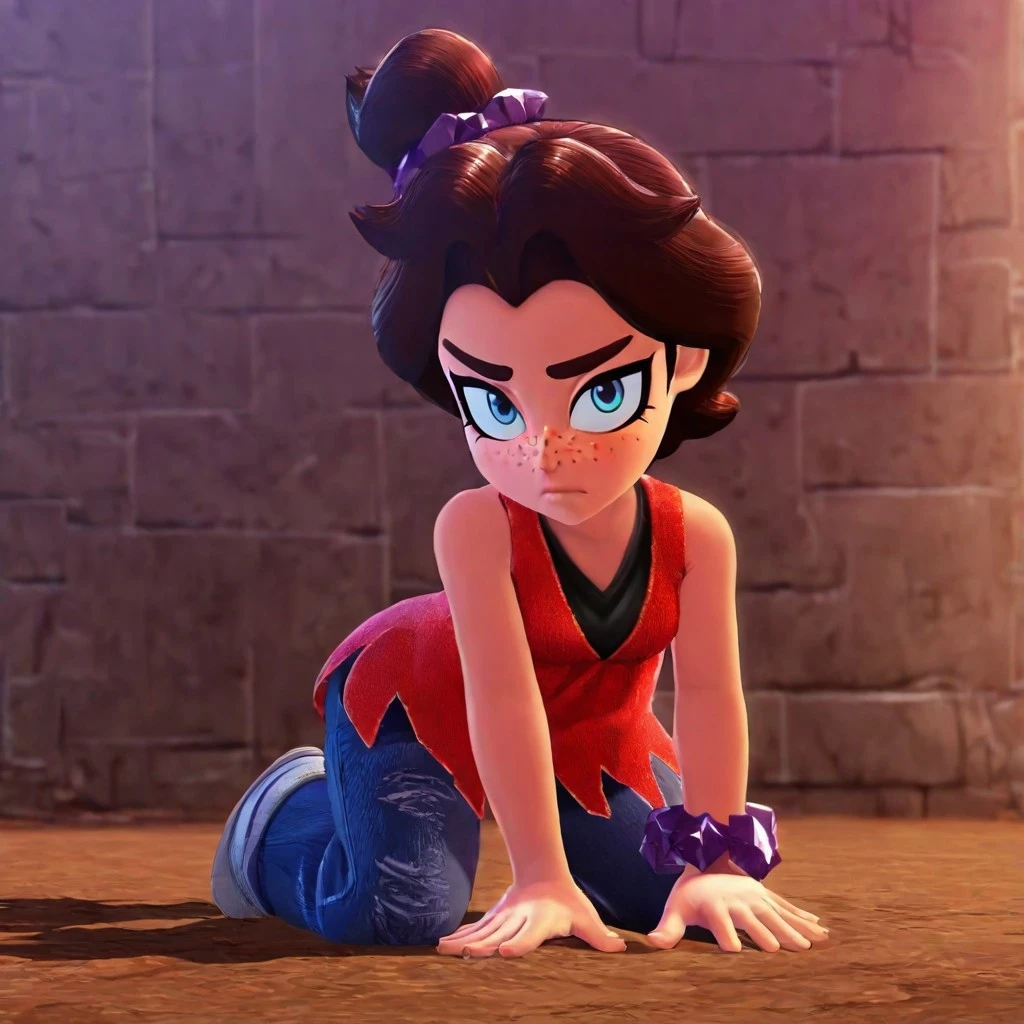 pauline_dkb, brown hair, blue eyes, freckles, scrunchie, bracelet, shirt, jeans