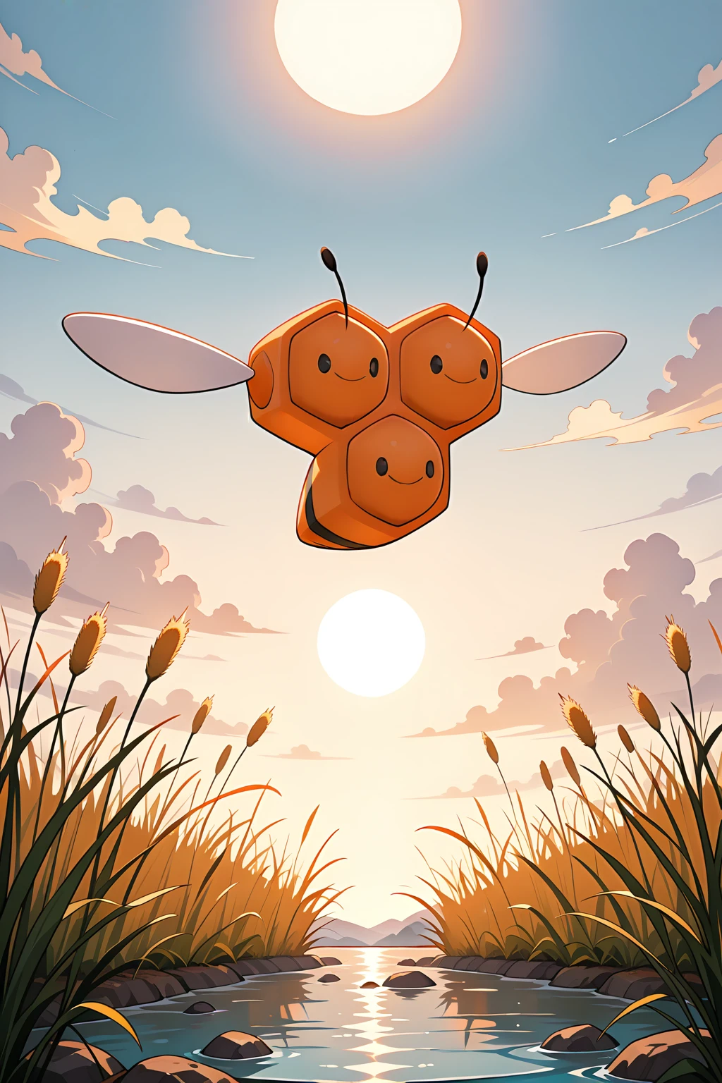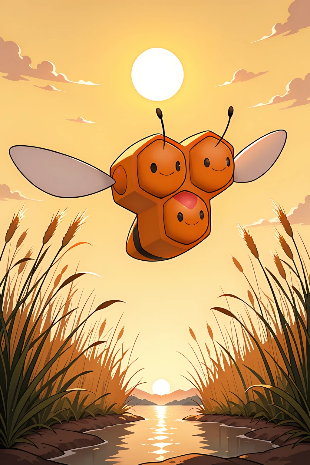 male shiny combee, pokemon (creature), orange body, honeycomb, three heads, black antenna, black eyes, smile, black stripes, white wings, pokemon art style, flat color,