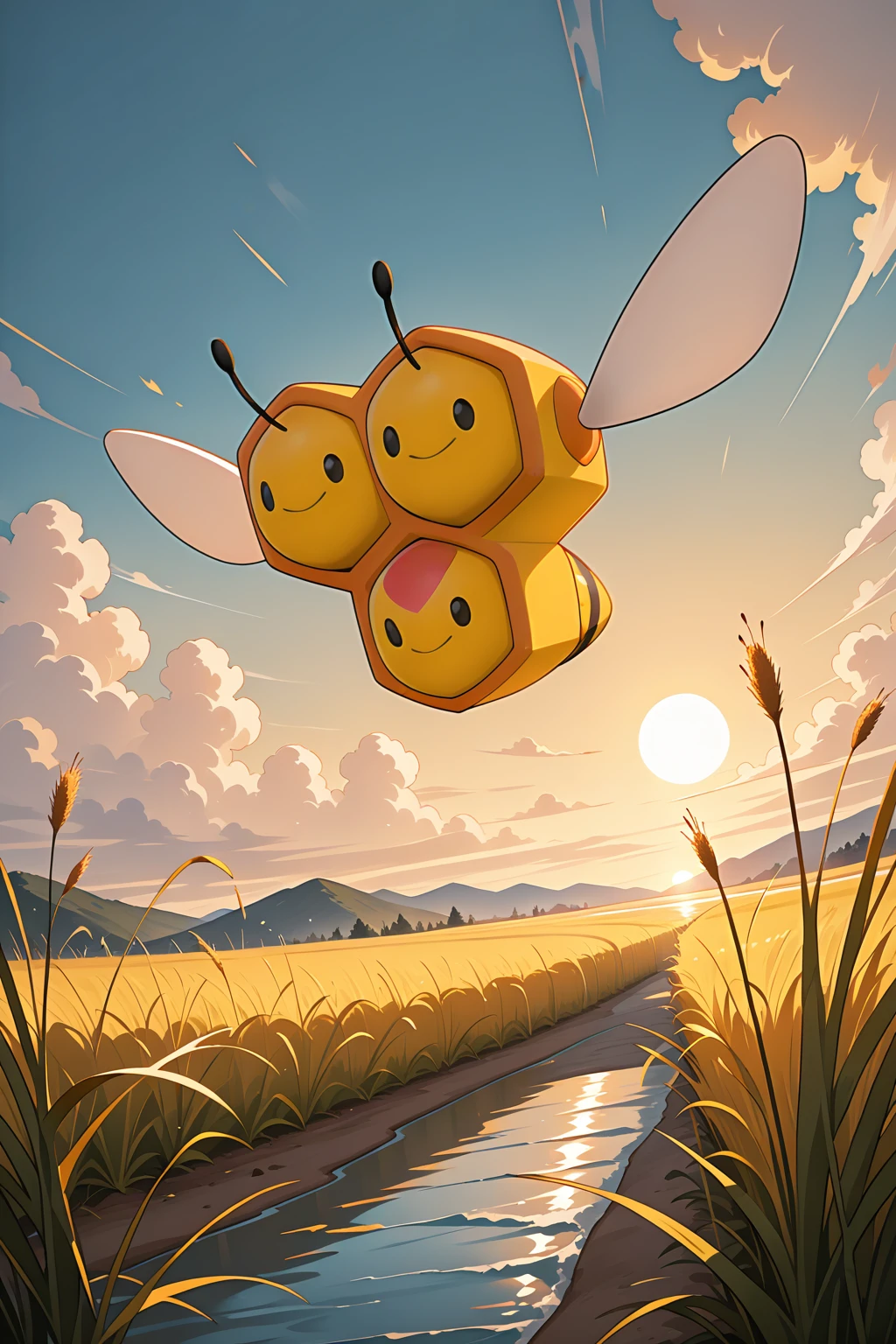 male combee, pokemon (creature), yellow body, honeycomb, three heads, black antenna, black eyes, smile, black stripes, white wings, pokemon art style, flat color,