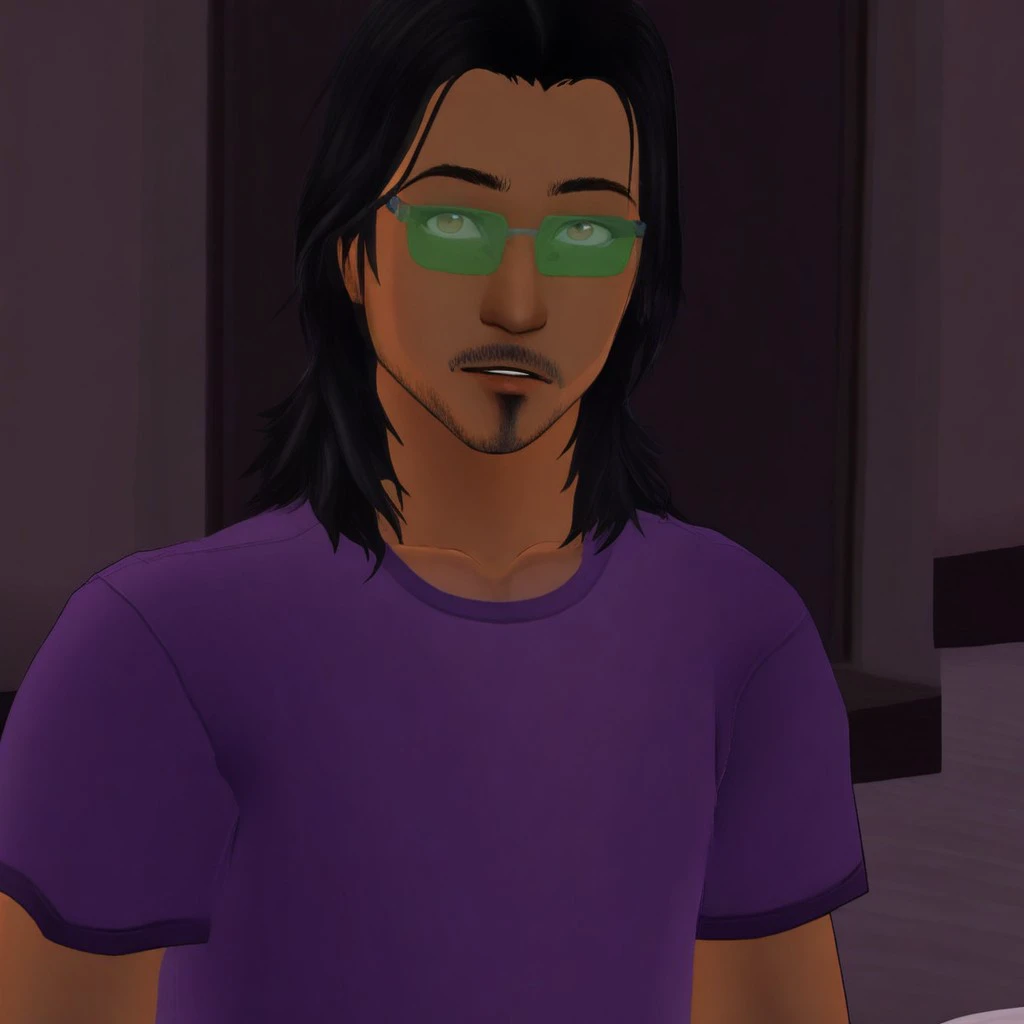 1man, black hair, ((medium hair)), brown eyes, green sunglasses, ((tanned skin)), beard stubble, purple t-shirt,jeans