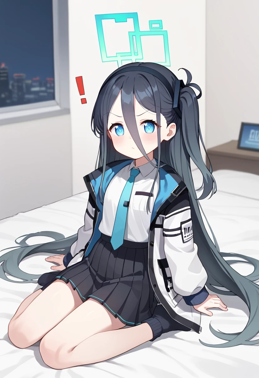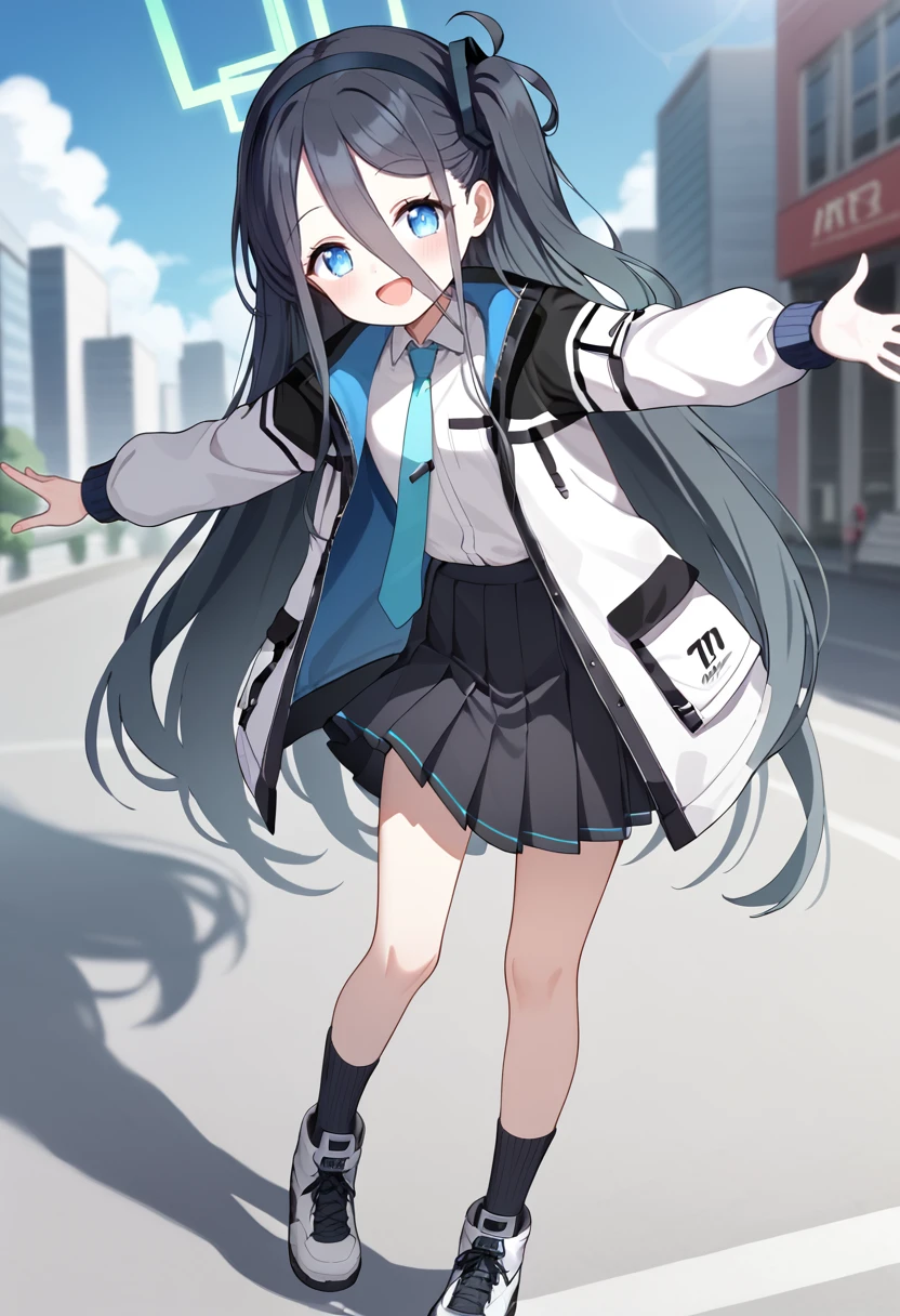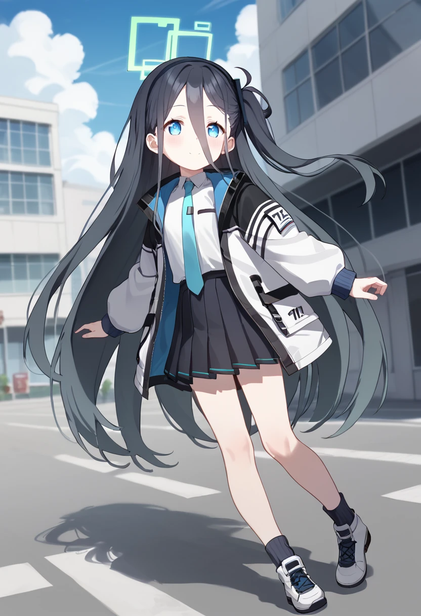 aris-default,aris \(blue archive\),blue eyes,one side up,absurdly long hair,hair hair between eyes,black hairband,halo,white jacket,necktie,pleated skirt,black socks,sneakers