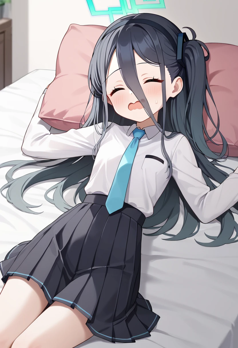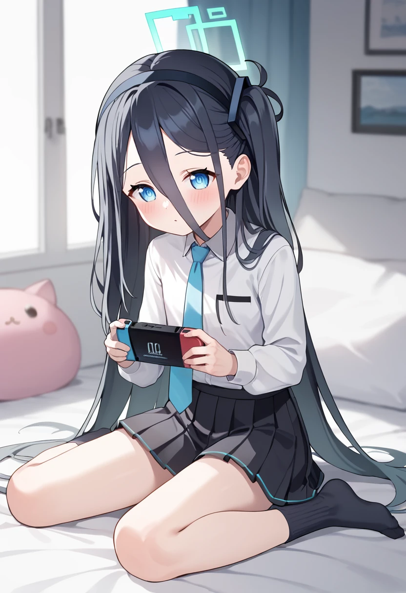 aris-shirt,aris \(blue archive\),blue eyes,one side up,absurdly long hair,hair between eyes,black hairband,halo,(white shirt:1.1),white long sleeves,necktie,(high-waist skirt:0.7),pleated skirt,black socks, sneakers