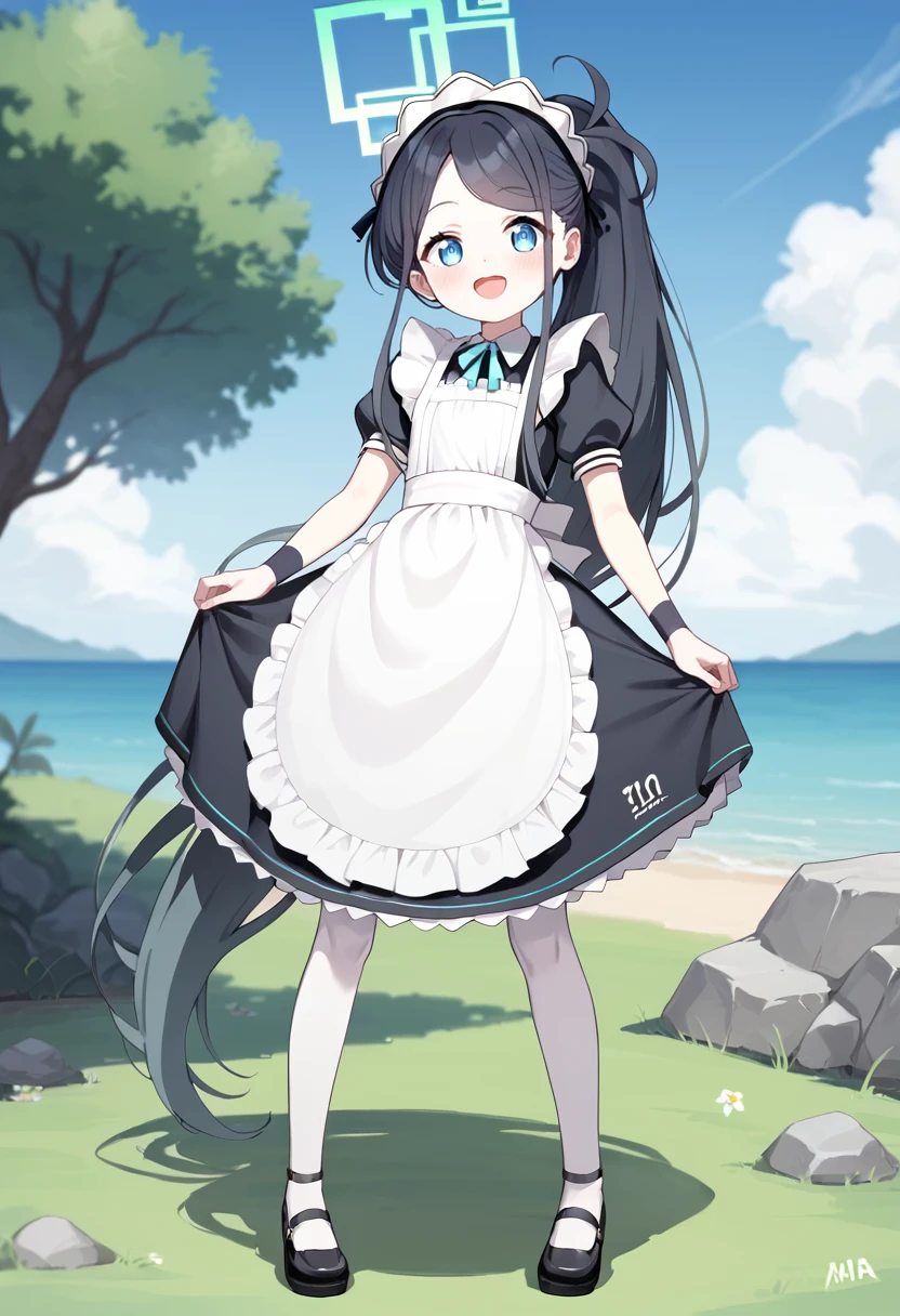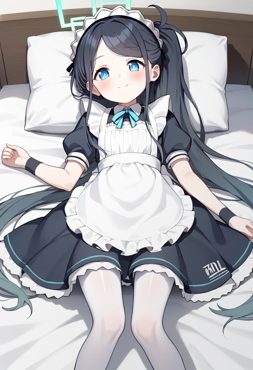 aris-maid, aris \(blue archive\),blue eyes,side ponytail,very long hair,sidelocks,halo,maid headdress,frilled apron,white pantyhose,mary janes