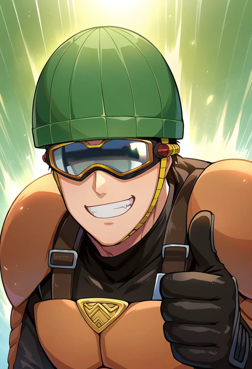 Mumen Rider, helmet, green helmet, helmet straps, yellow helmet straps, goggles, belt, battle armor, bicycle