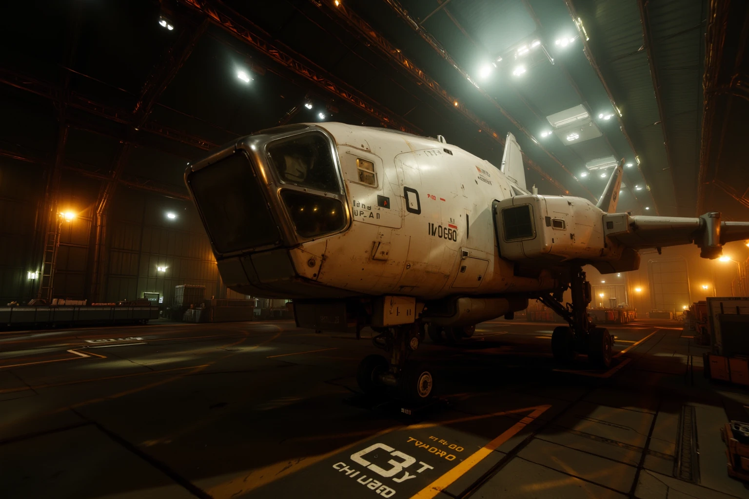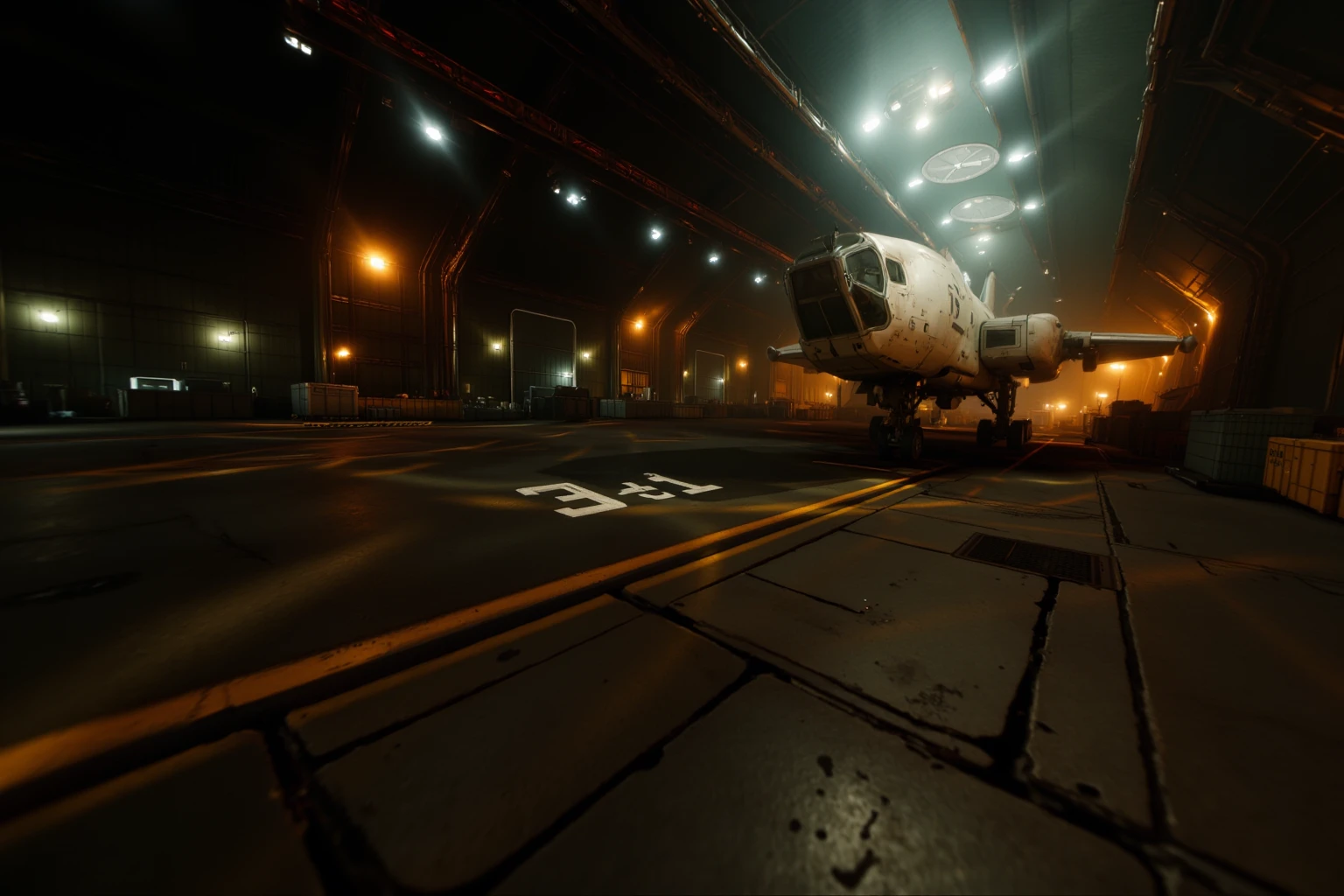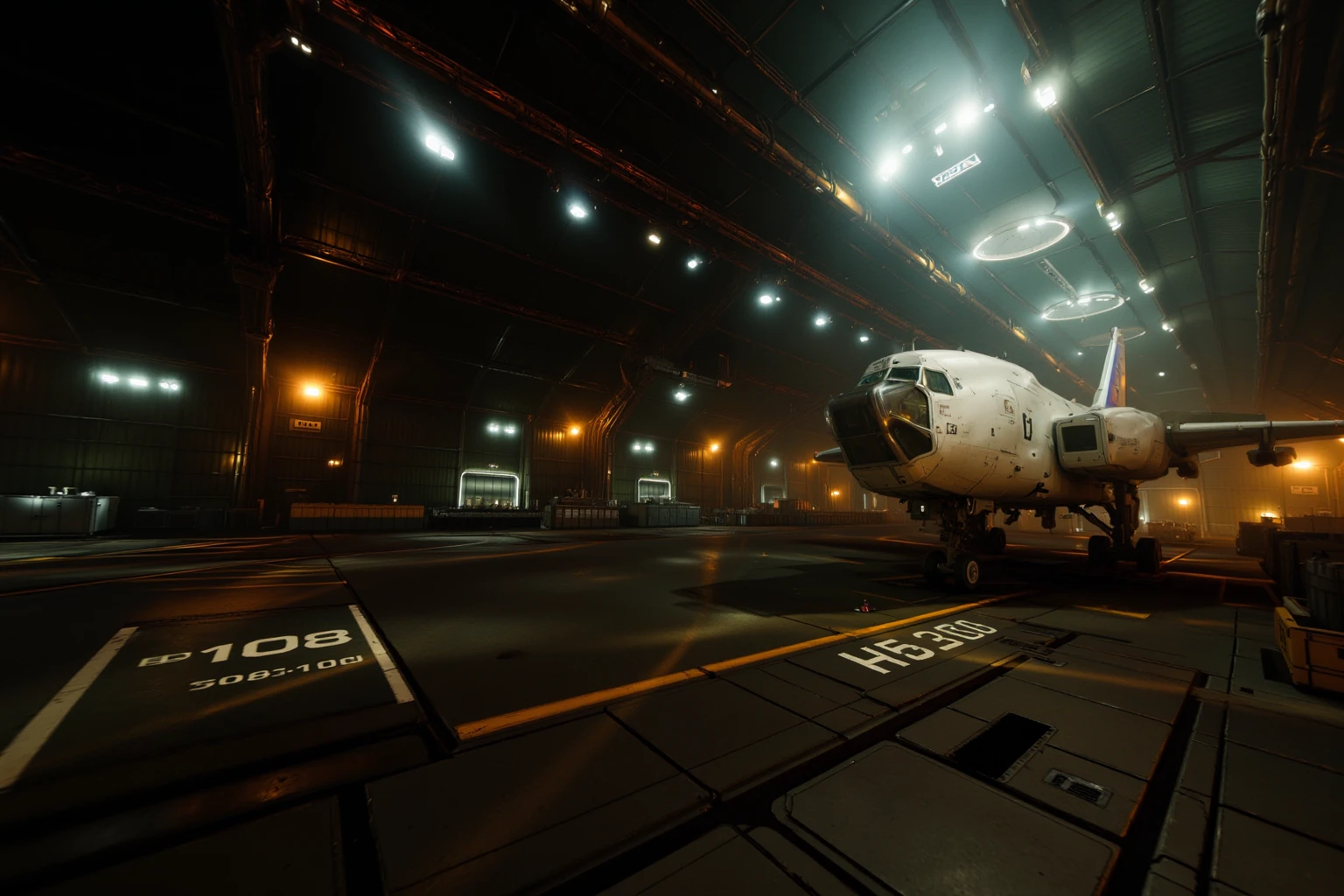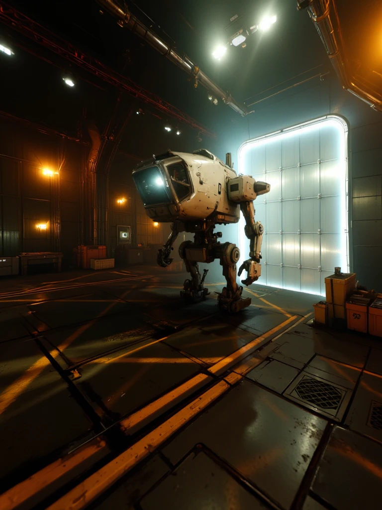 The scene is a cinematic rendering of a spacious industrial hangar, characterized by a utilitarian aesthetic and a robust, functional tone. The overall atmosphere is one of immense scale and technical readiness, imbued with the warm glow of artificial light. A large, formidable multi-legged vehicle, resembling an armored transport or walker, stands centrally within the hangar, its heavy, articulated legs supporting a massive, box-like body. The vehicle's frontal section features a prominent, rectangular cockpit area with multiple reinforced window panels, suggesting a command bridge or observation deck. Markings on the vehicle's side, including the number "10" and text such as "CMAC MATRO," provide hints of its designation or origin. The hangar itself is vast, with a high ceiling crisscrossed by numerous metal beams, gantries, and overhead lighting fixtures that emit a strong, yellowish light, casting long shadows. On the left side of the vehicle, the hangar wall curves, revealing large, arched doorways or entry points, likely designed to accommodate such massive machinery. Along the right side of the vehicle, the hangar floor extends, revealing more industrial equipment, storage containers, and what appear to be work areas with additional lighting. In the far background, a large, circular opening in the ceiling, possibly a skylight or a docking bay, allows for an additional, diffused light source to filter down into the space. The floor beneath the vehicle is a solid, dark concrete or metal surface, showing wear from heavy use, with visible tracks or grooves for movement. The massive multi-legged vehicle is positioned centrally within the vast hangar, its front oriented towards the viewer. The curved hangar wall and large arched doorways are located to the vehicle's left. The industrial equipment and work areas extend to the vehicle's right. The circular ceiling opening is situated directly above and behind the vehicle, high in the hangar. The 360 scene is faultless.