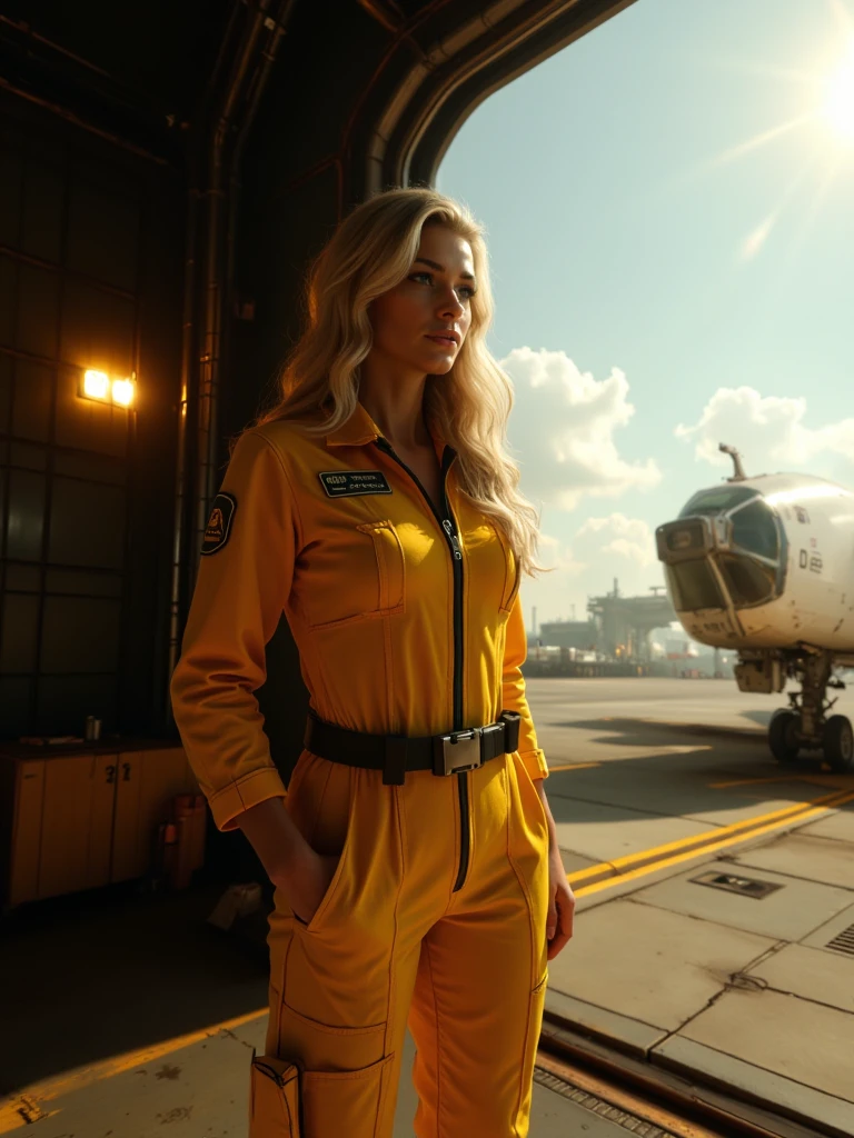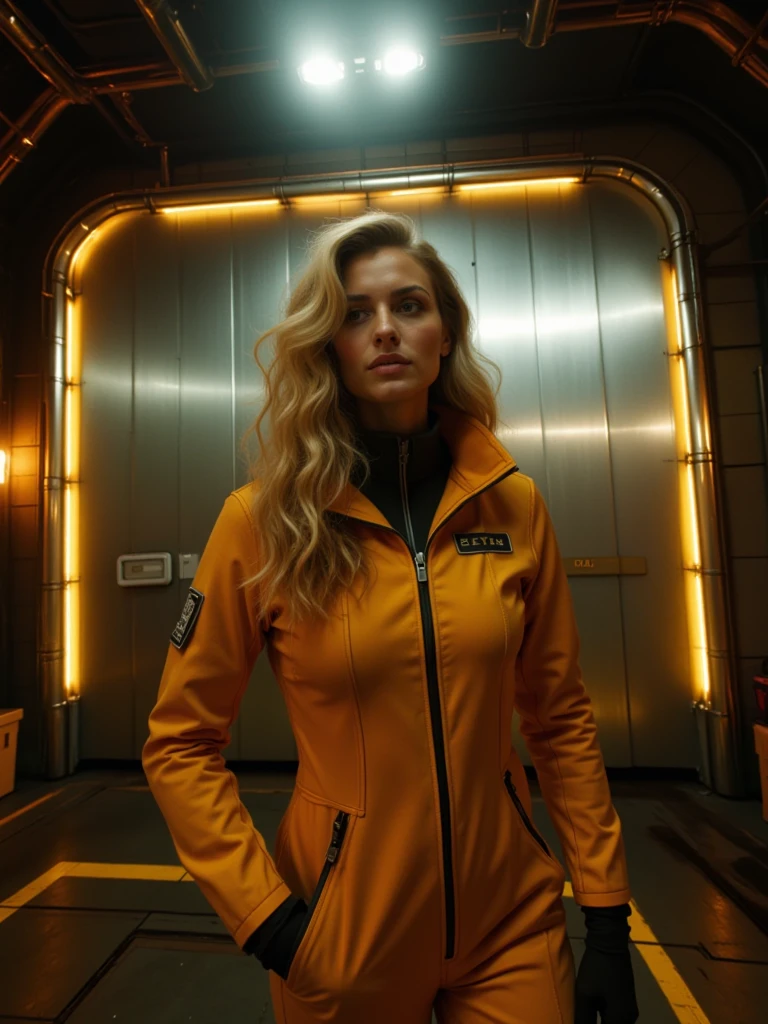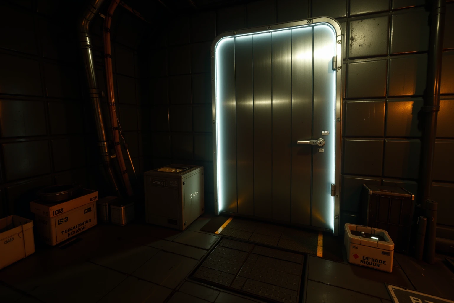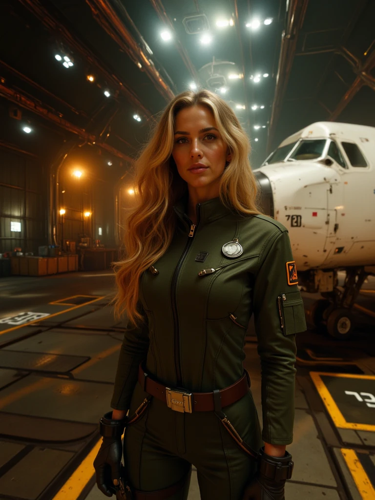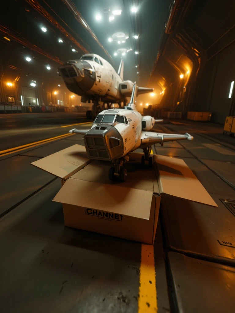 The scene is a cinematic rendering of a spacious industrial hangar, characterized by a utilitarian aesthetic and a robust, functional tone. The overall atmosphere is one of immense scale and technical readiness, imbued with the warm glow of artificial light. A large, formidable multi-legged vehicle, resembling an armored transport or walker, stands centrally within the hangar, its heavy, articulated legs supporting a massive, box-like body. The vehicle's frontal section features a prominent, rectangular cockpit area with multiple reinforced window panels, suggesting a command bridge or observation deck. Markings on the vehicle's side, including the number "10" and text such as "CMAC MATRO," provide hints of its designation or origin. The hangar itself is vast, with a high ceiling crisscrossed by numerous metal beams, gantries, and overhead lighting fixtures that emit a strong, yellowish light, casting long shadows. On the left side of the vehicle, the hangar wall curves, revealing large, arched doorways or entry points, likely designed to accommodate such massive machinery. Along the right side of the vehicle, the hangar floor extends, revealing more industrial equipment, storage containers, and what appear to be work areas with additional lighting. In the far background, a large, circular opening in the ceiling, possibly a skylight or a docking bay, allows for an additional, diffused light source to filter down into the space. The floor beneath the vehicle is a solid, dark concrete or metal surface, showing wear from heavy use, with visible tracks or grooves for movement. The massive multi-legged vehicle is positioned centrally within the vast hangar, its front oriented towards the viewer. The curved hangar wall and large arched doorways are located to the vehicle's left. The industrial equipment and work areas extend to the vehicle's right. The circular ceiling opening is situated directly above and behind the vehicle, high in the hangar. The 360 scene is faultless.