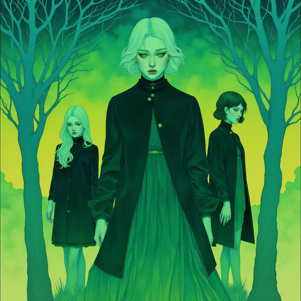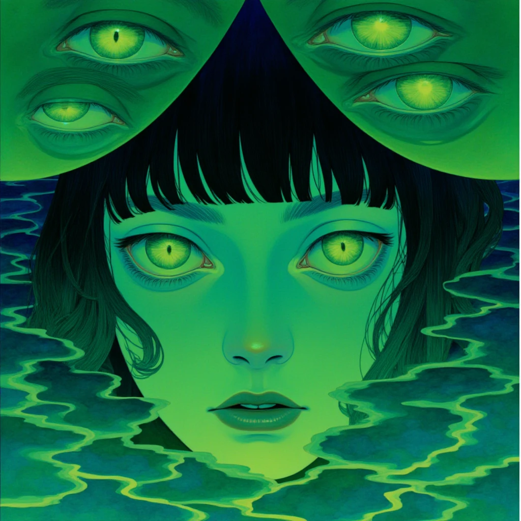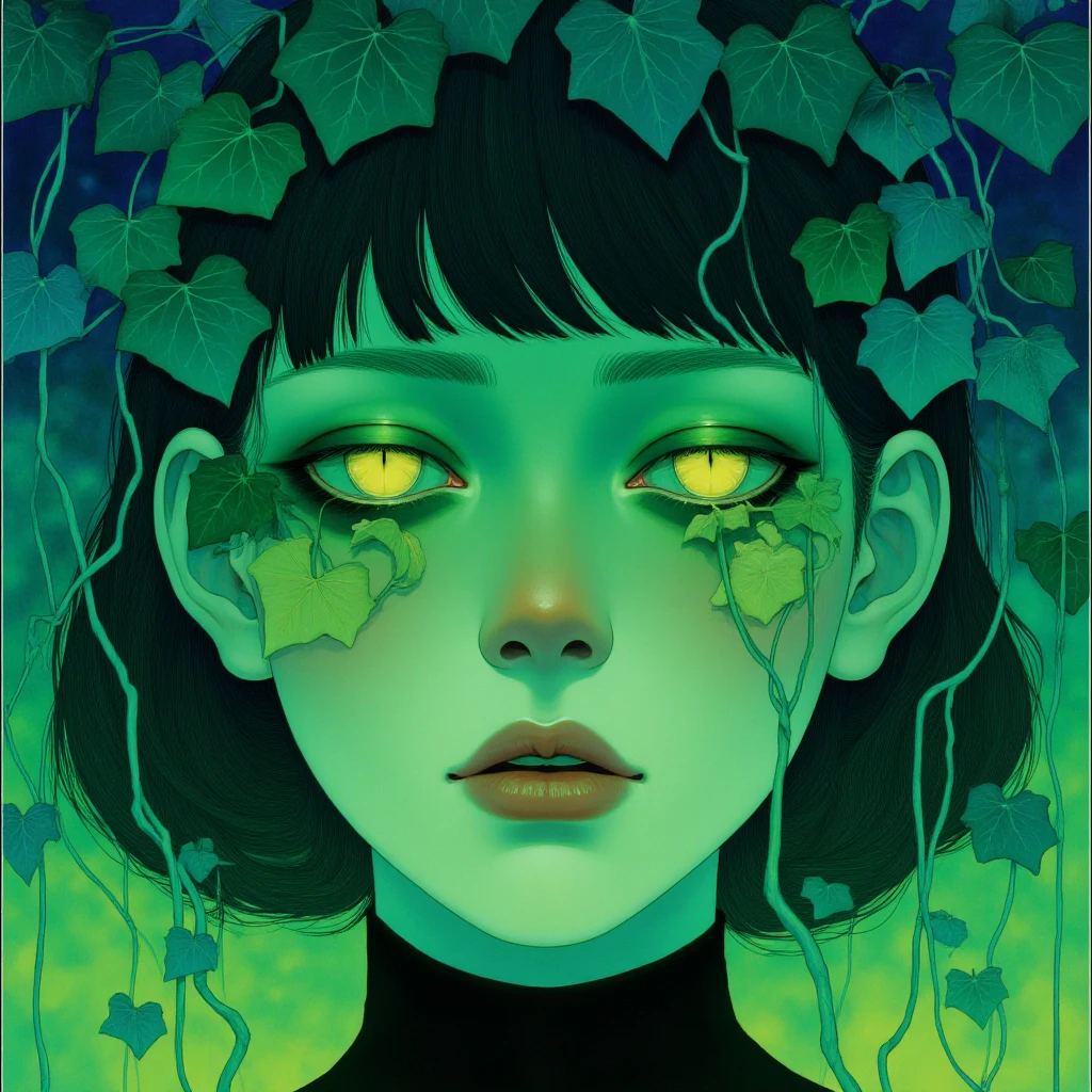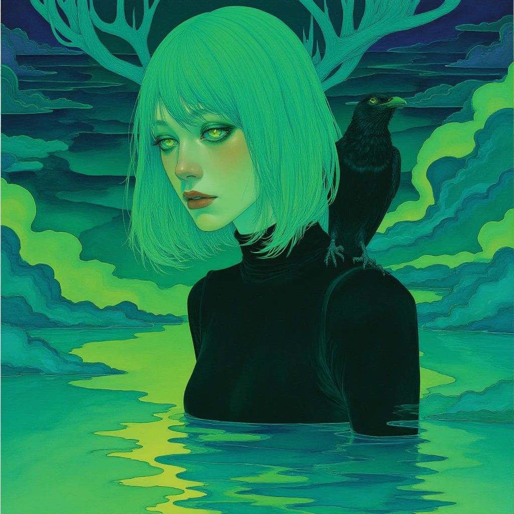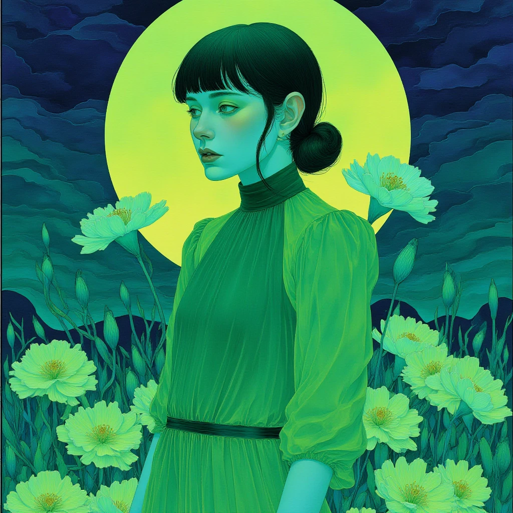 This LoRA is a melancholic dream in glowing greens and blues, focused on elongated, dreamy figures, symbolic flora, and trance-like moods.