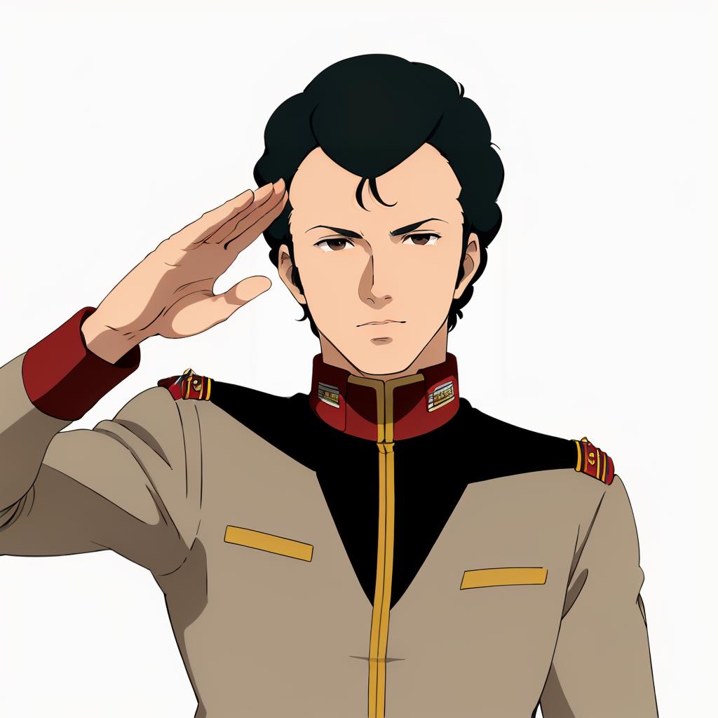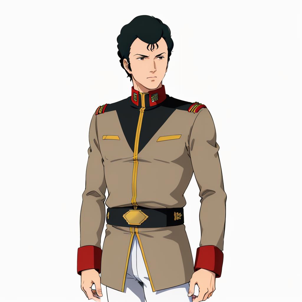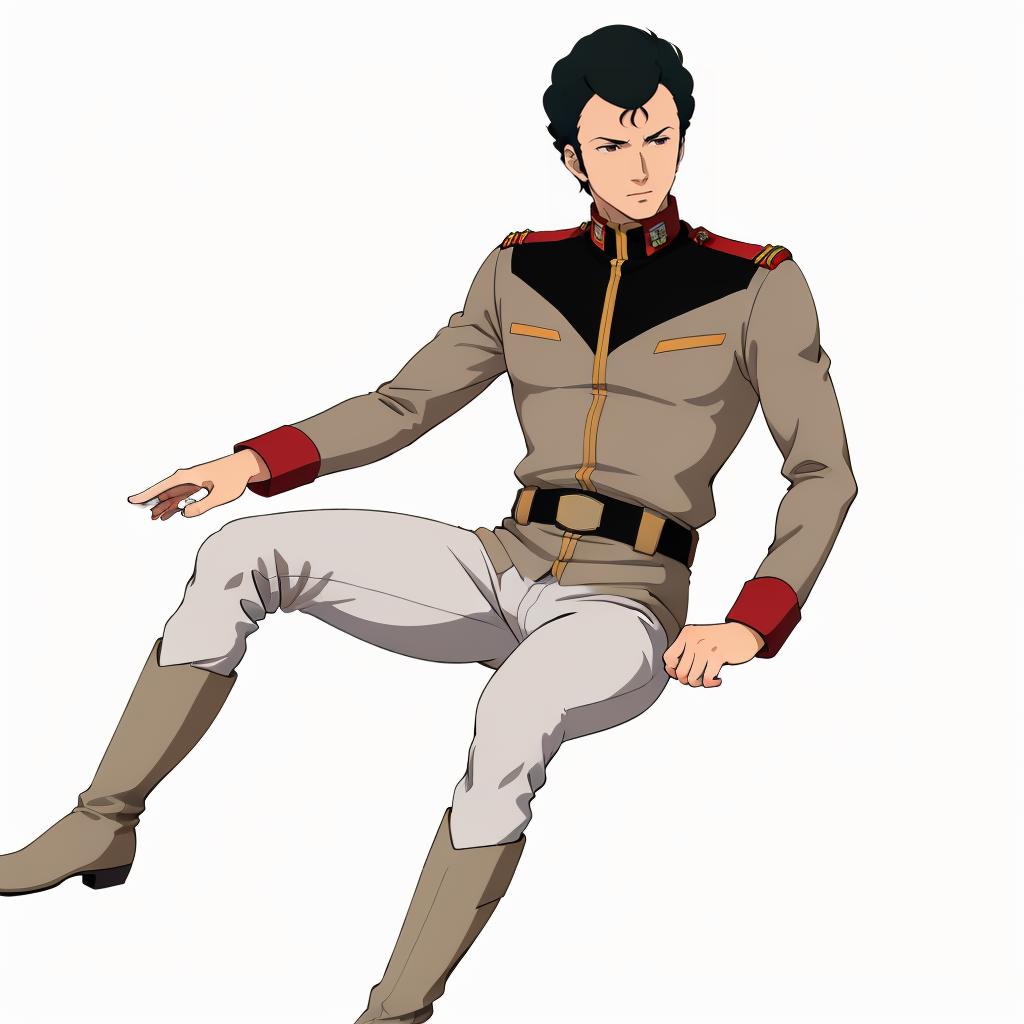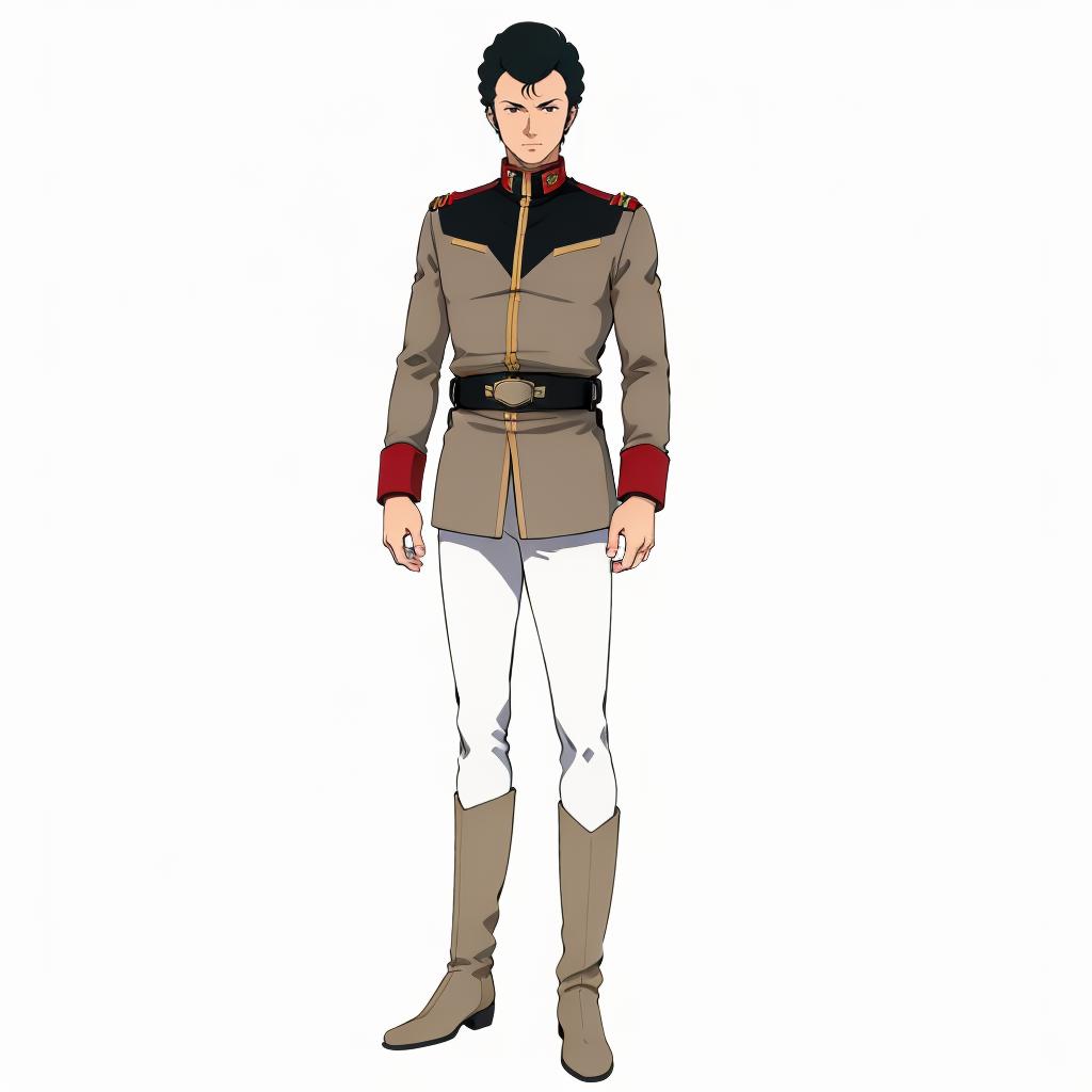 brightnoa,1man, black hair,black eyes, khaki military uniform,jacket,long sleeves, belt, white pants, boots,