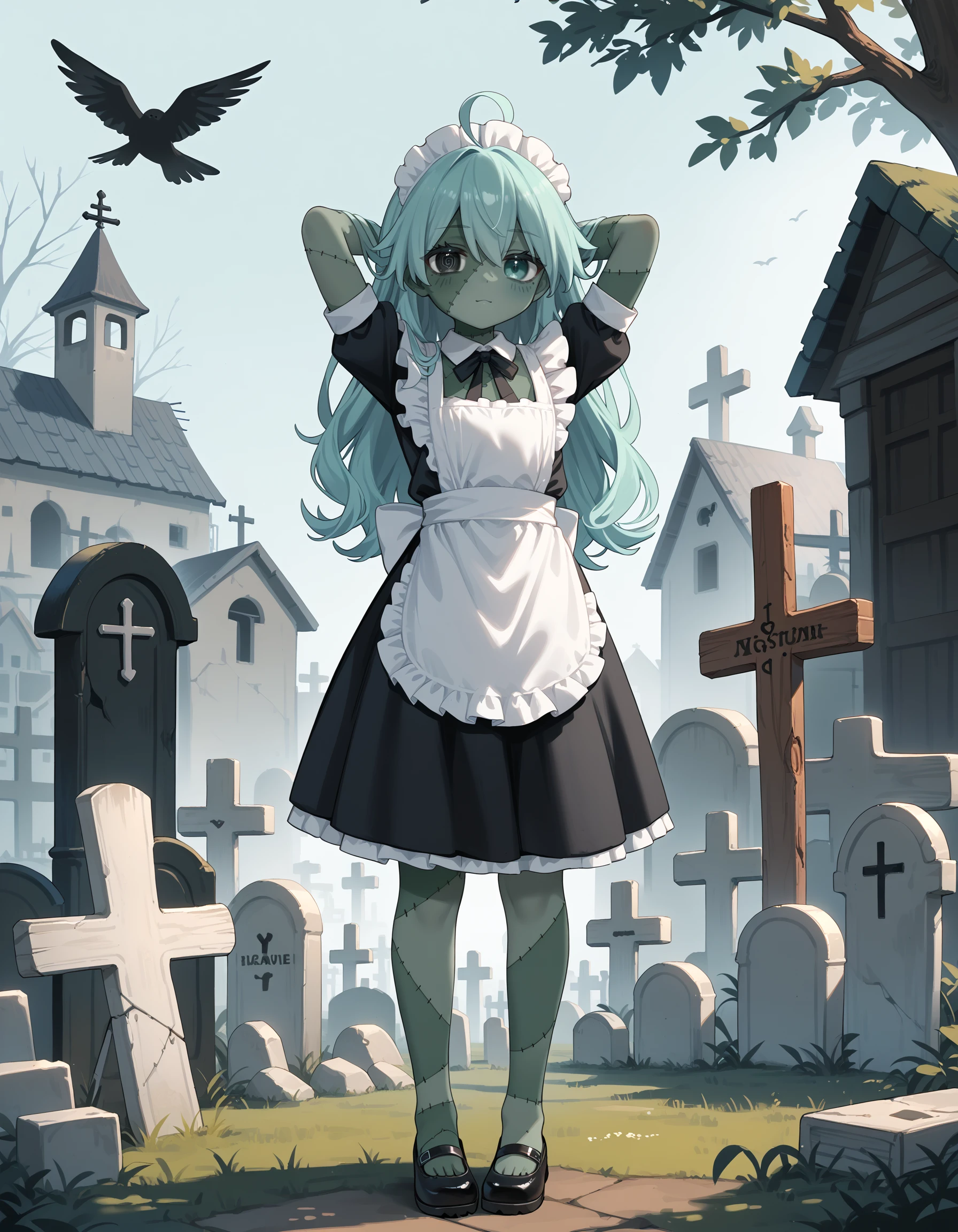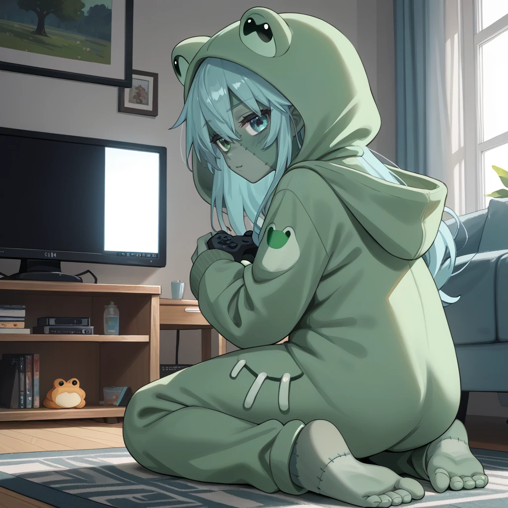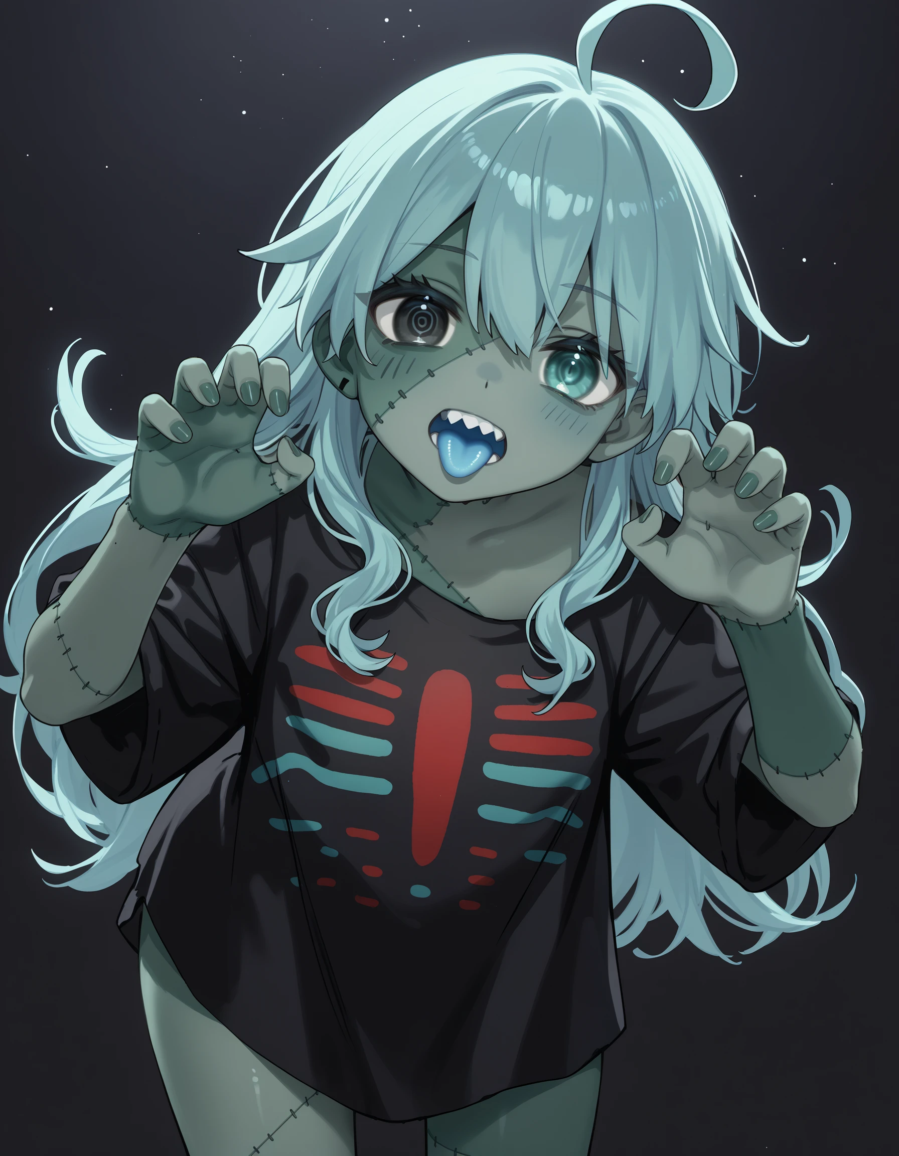 s1nuuki, green skin, stitches, patchwork skin, blue hair, long hair, ahoge, green eyes, heterochromia, sharp teeth, blue tongue,