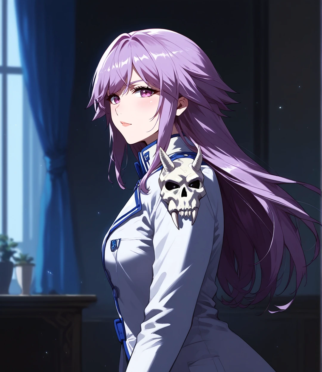 HaNarin, purple eyes, lavender hair, long hair, skull on shoulder, battle uniform,