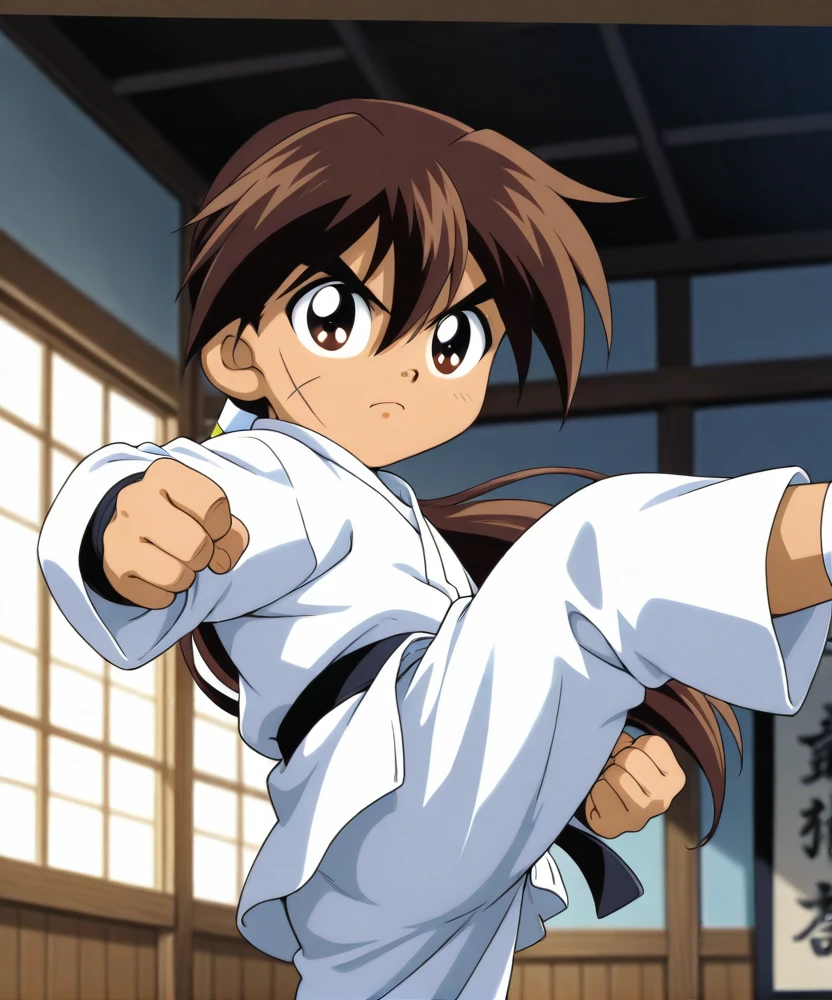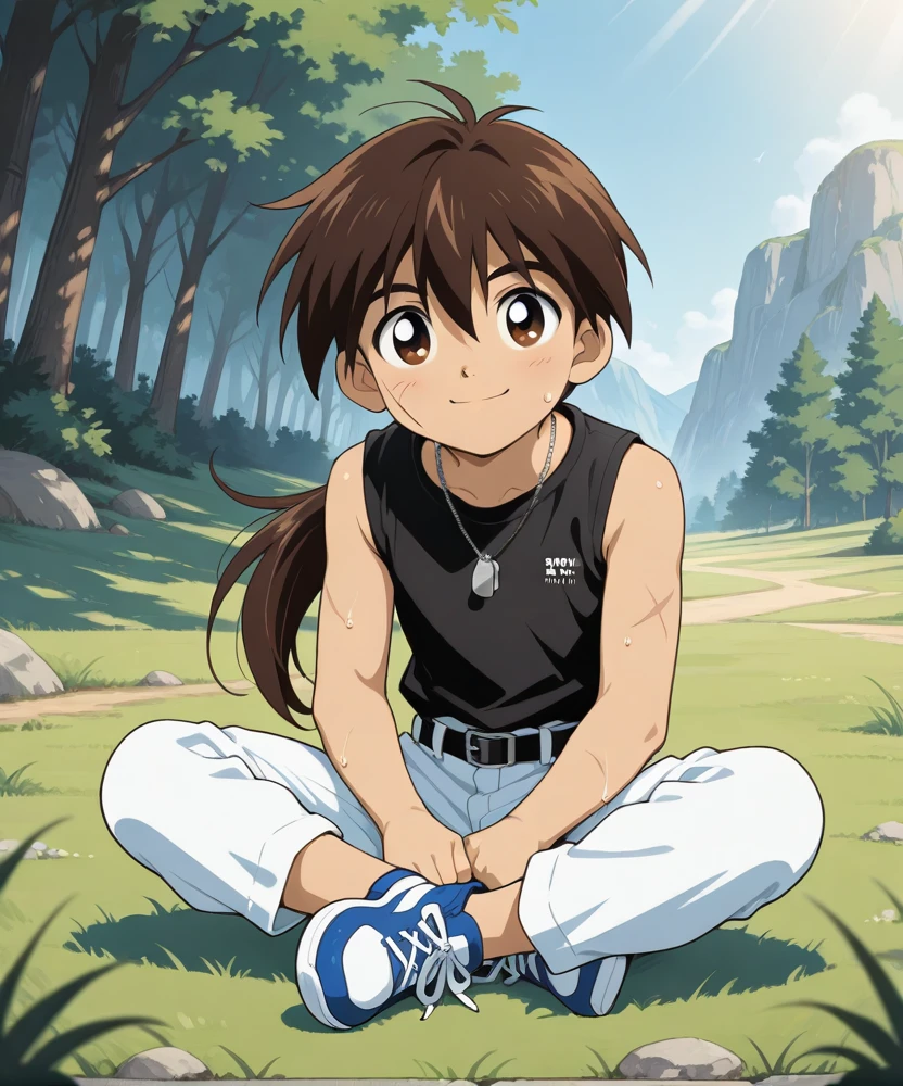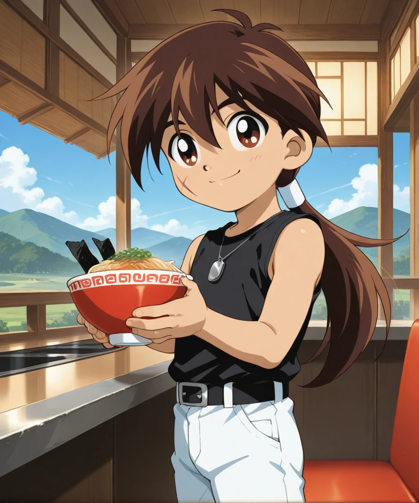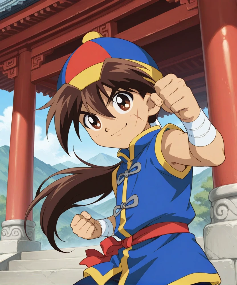 1boy, male focus, Wen, brown hair, long hair, ponytail, chinese hat, brown eyes, blue vest, blue pants