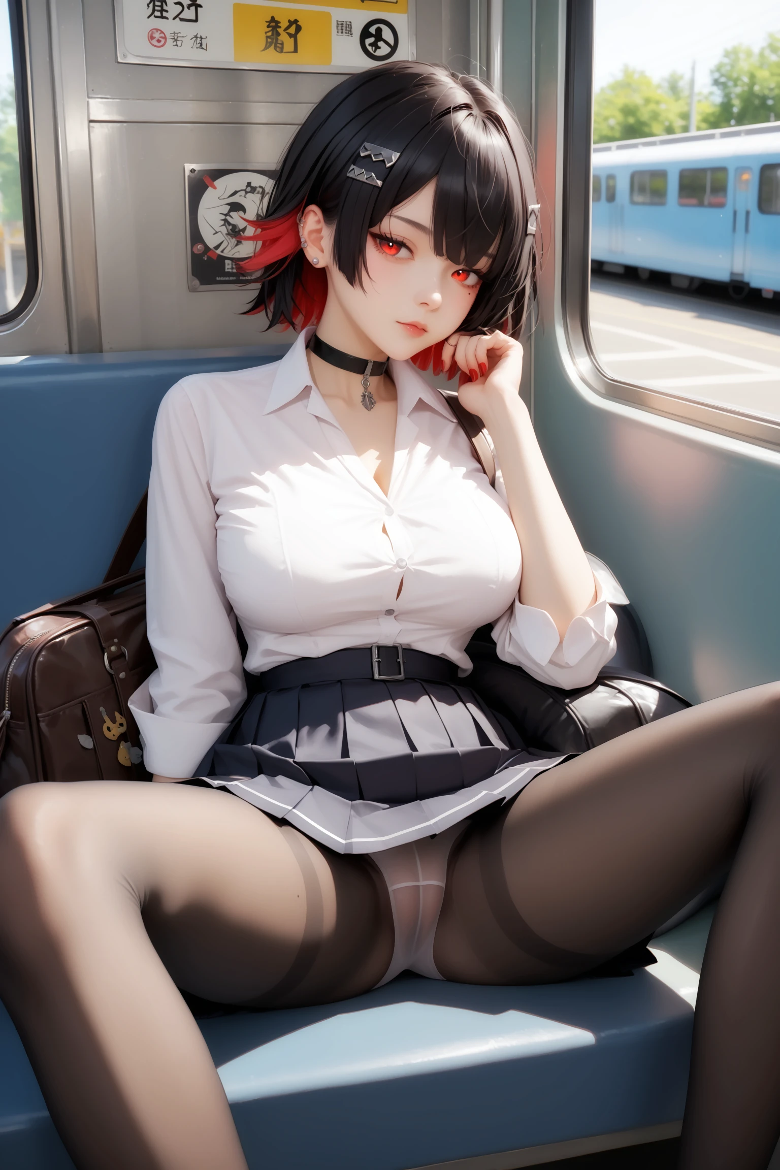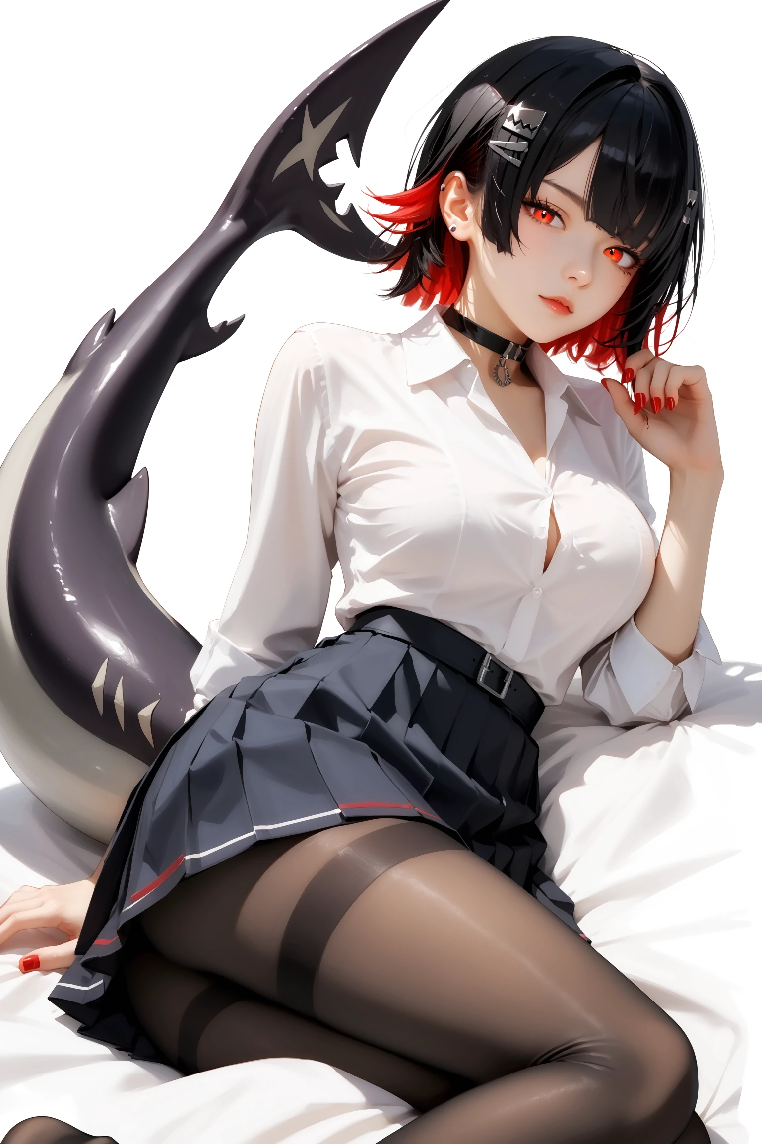 Schoolgirl Outfit : shirt, skirt, white shirt, pantyhose, choker, pleated skirt, red nails, collared shirt