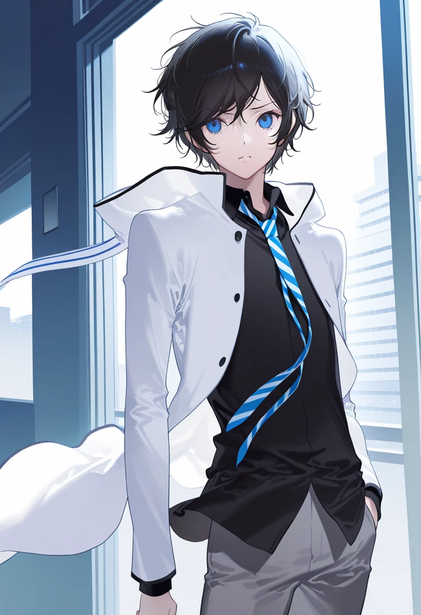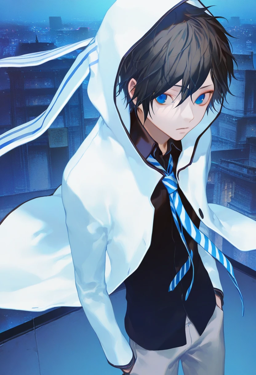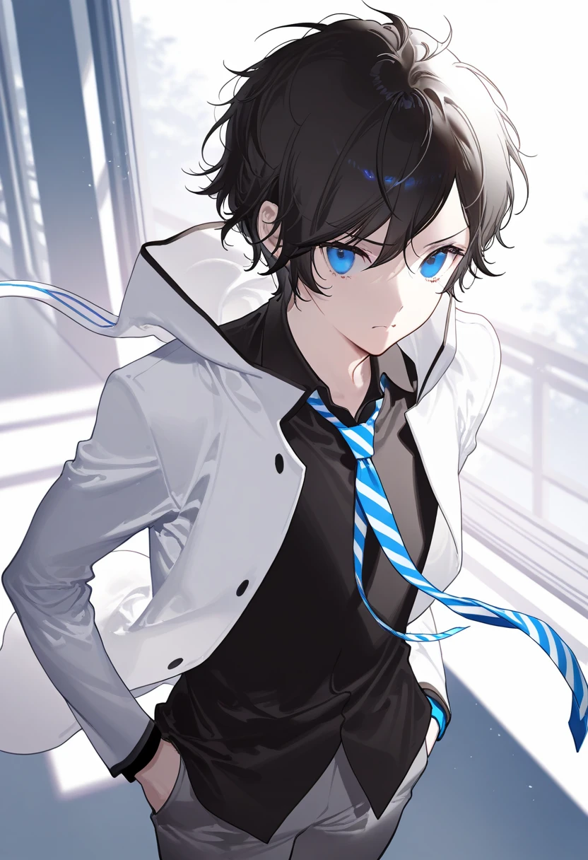 white jacket, hooded jacket, black shirt, striped necktie, grey pants
