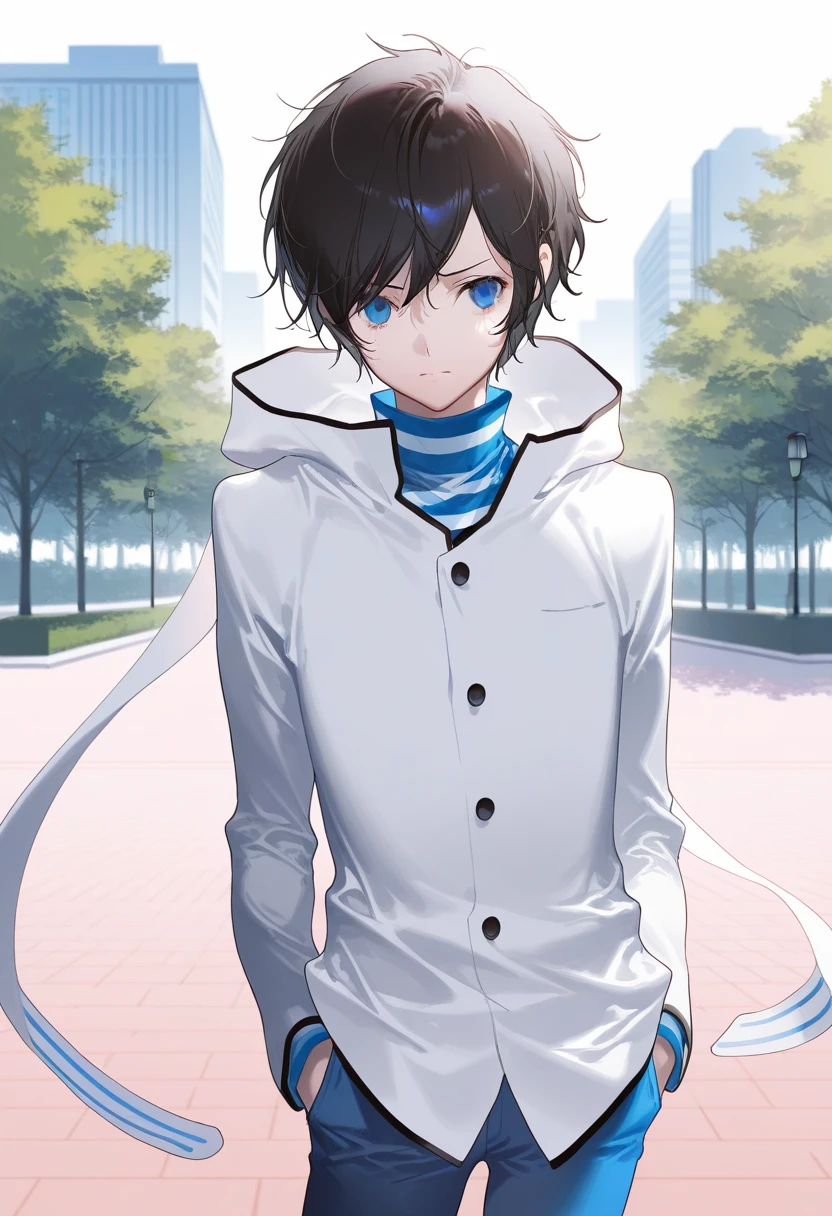 white jacket, hooded jacket, striped shirt, turtleneck, blue pants