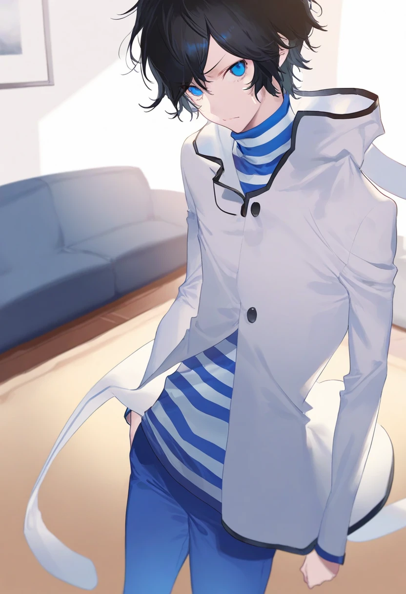 protagonist \(devil survivor 2\), black hair, short hair, blue eyes