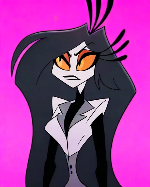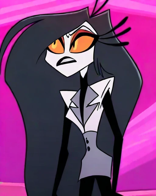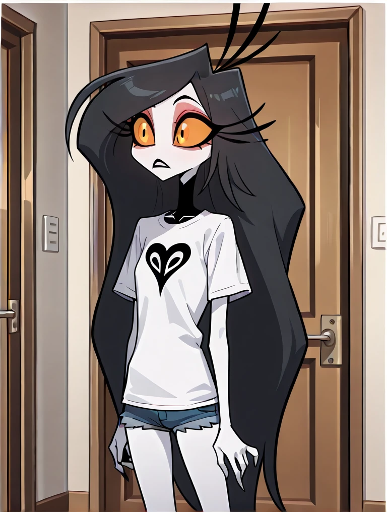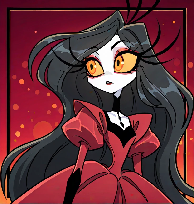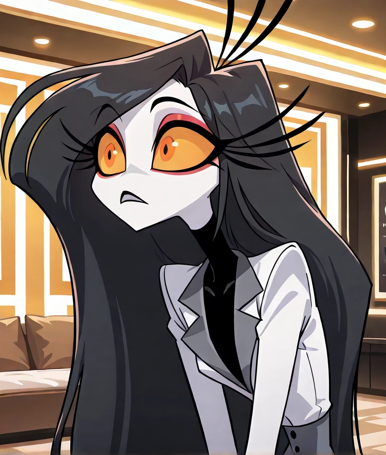 o.e.d., black hair, white skin, long eyelashes, yellow sclera, orange eyes, long hair
